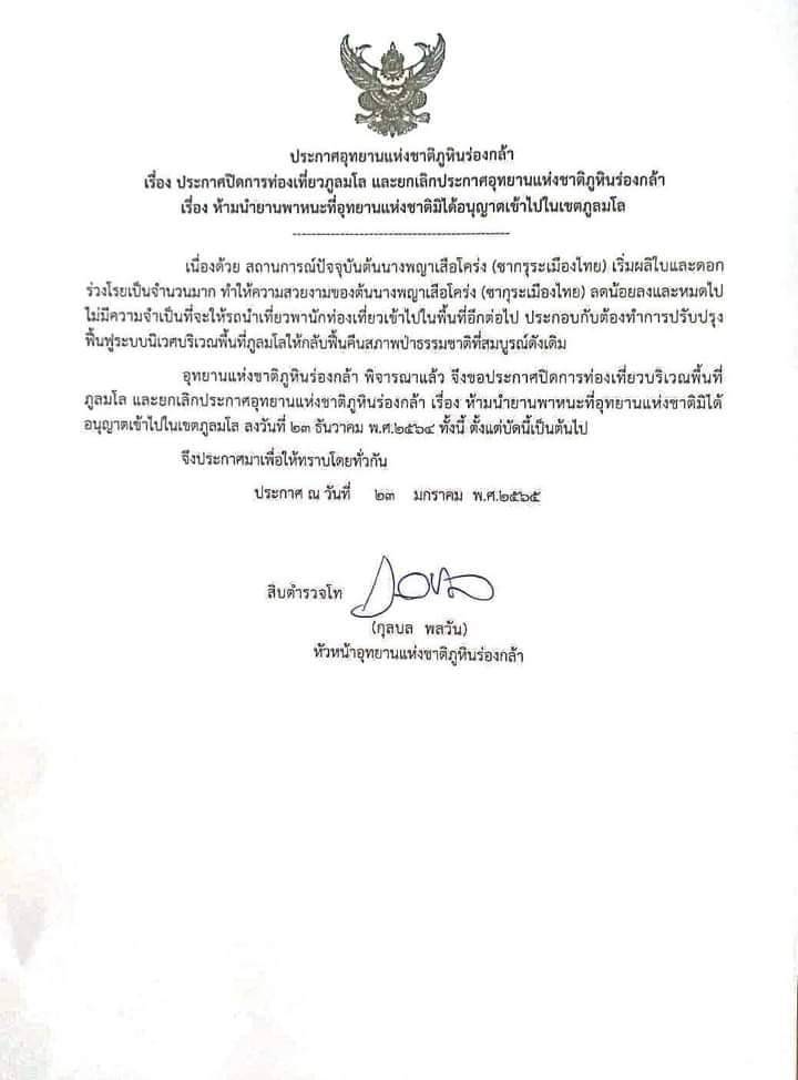 อุทยานแห่งชาติภูหินร่องกล้า พิจารณาแล้ว จึงขอประกาศปิดการท่องเที่ยวบริเวณพื้นที่ภูลมโล และยกเลิกประกาศอุทยานแห่งชาติหินร่องกล้า เรื่อง ห้ามน้ำยานพาหนะที่อุทยานแห่งชาติมิได้อนุญาตเข้าไปในเขตภูลมโล ลงวันที่ 23 ธันวาคม พ.ศ.2565 ทั้งนี้ ตั้งแต่บัดนี้เป็นต้นไป