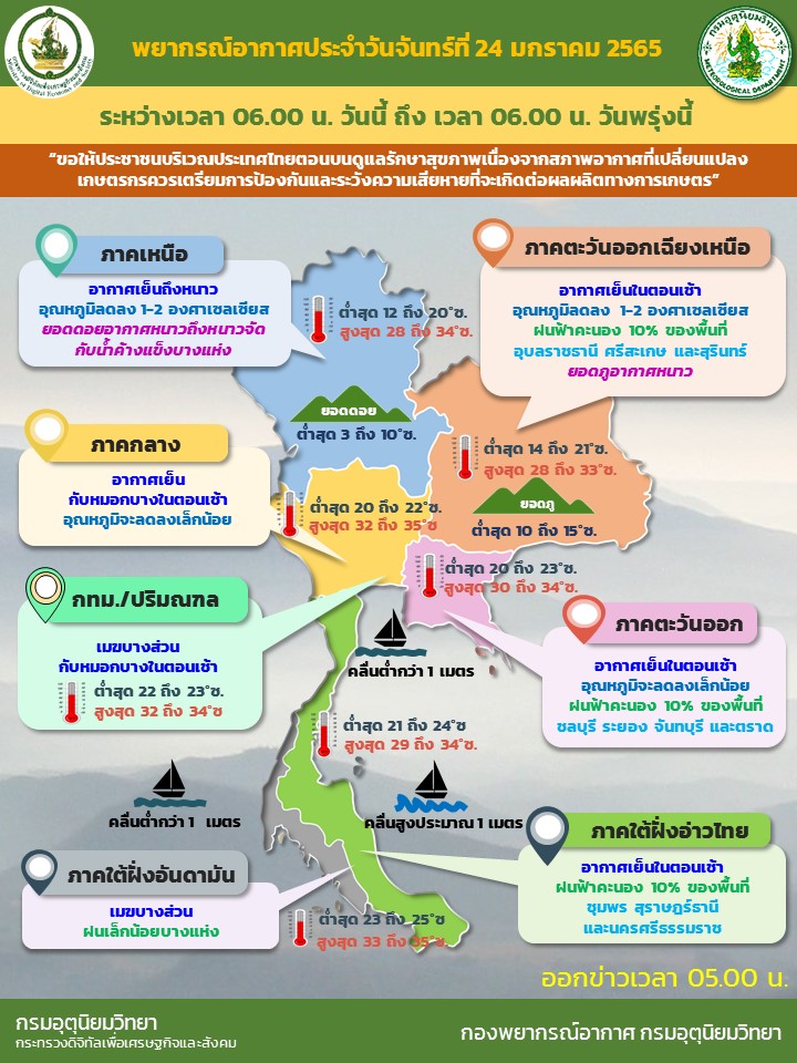 พยากรณ์อากาศประจำวันที่ 24 มกราคม 2565 พยากรณ์อากาศ 24 ชั่วโมงข้างหน้า ลมตะวันตกในระดับบนพัดปกคลุมภาคเหนือและภาคกลาง ทำให้บริเวณดังกล่าวจะมีอากาศเย็นลง และอุณหภูมิจะลดลง 1-2 องศาเซลเซียสในภาคเหนือ กับมีน้ำค้างแข็งบางพื้นที่ในบริเวณยอดดอย ส่วนภาคกลางอุณหภูมิจะลดลงเล็กน้อย ในขณะที่ลมใต้และลมตะวันออกเฉียงใต้พัดปกคลุมภาคตะวันออกเฉียงเหนือและภาคตะวันออก ลักษณะเช่นนี้ทำให้บริเวณดังกล่าวยังคงมีฝนฟ้าคะนองเกิดขึ้นเป็นบางพื้นที่ ขอให้ประชาชนบริเวณประเทศไทยตอนบนดูแลรักษาสุขภาพเนื่องจากสภาพอากาศที่เปลี่ยนแปลงในระยะนี้ และเกษตรกรควรเตรียมการป้องกันและระวังความเสียหายที่จะเกิดต่อผลผลิตทางการเกษตรไว้ด้วย