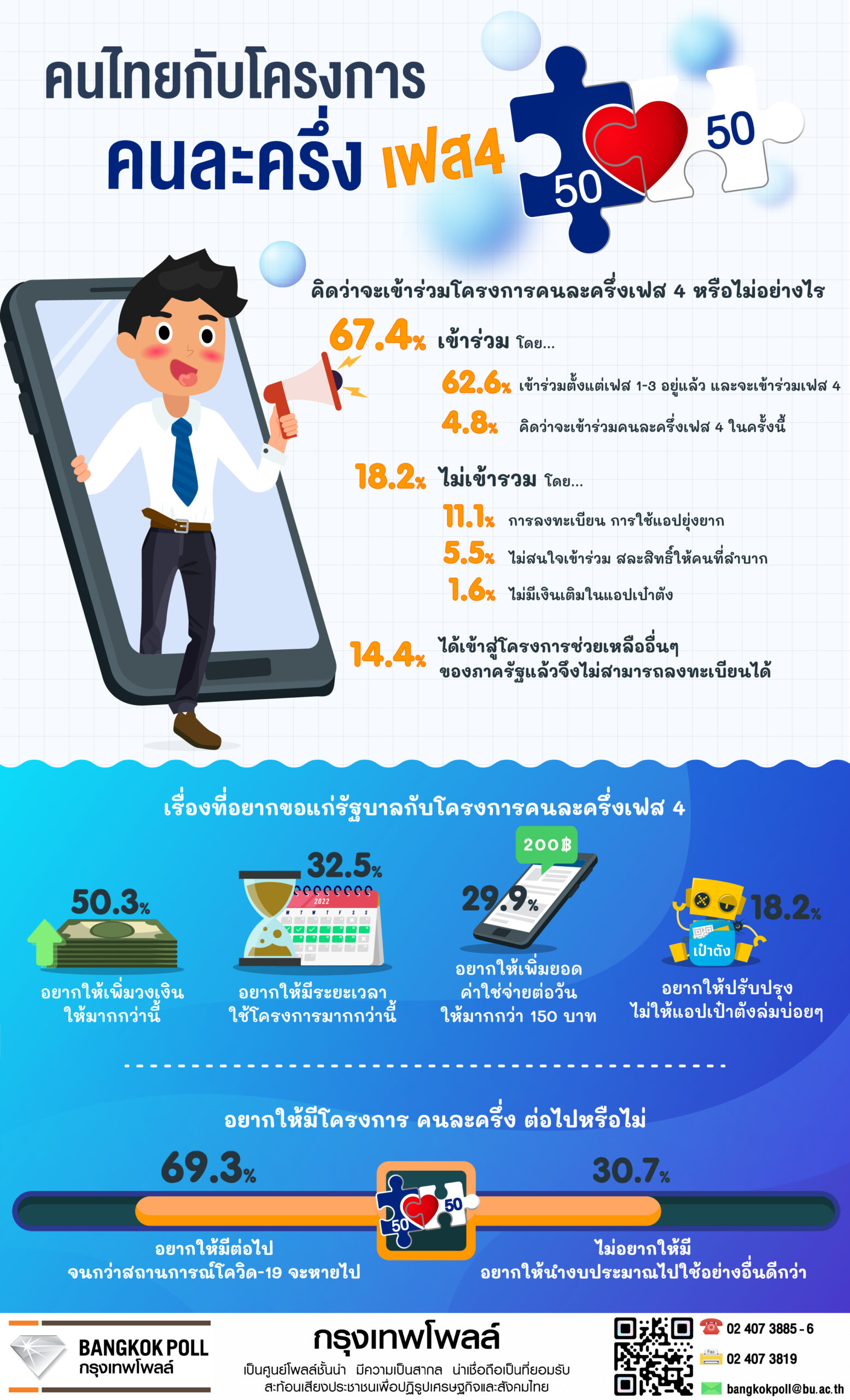 กรุงเทพโพล ปชช.อยากให้มีโครงการคนละครึ่งจนกว่าโควิดจะหาย ขอรัฐบาลเพิ่มวงเงินเฟส4มากขึ้น