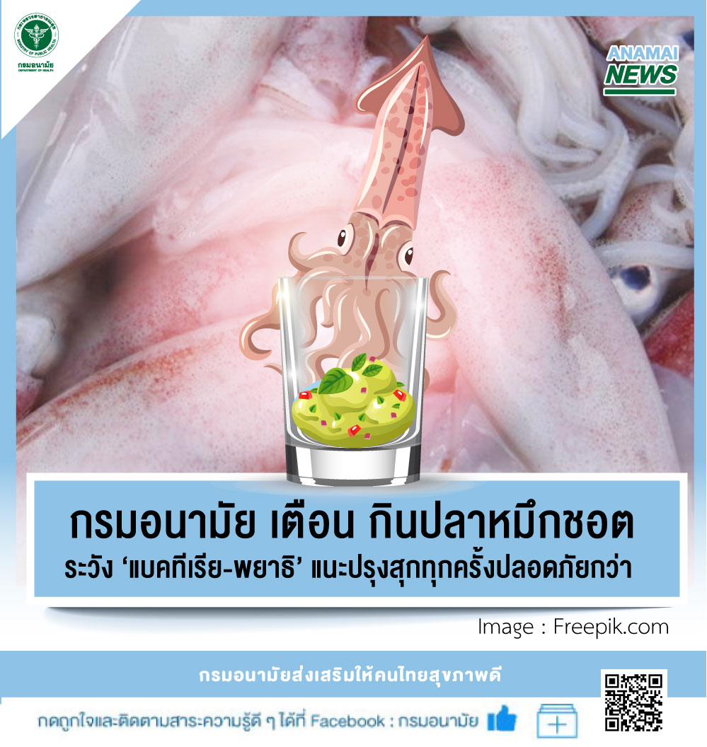 นายแพทย์สุวรรณชัย วัฒนายิ่งเจริญชัย อธิบดีกรมอนามัย กล่าวว่า กระแสการกิน “ปลาหมึกช็อต” เป็นการนำปลาหมึกสดตัวเล็ก จุ่มหัวลงในแก้วที่บรรจุน้ำจิ้ม เพื่อให้หมึกดูดน้ำจิ้มซีฟู้ดเข้าตัว จากนั้นผู้บริโภคจะกินปลาหมึกโดยกัดส่วนหัวและหั่นส่วนลำตัวกินต่อ ซึ่งพฤติกรรมการกินดังกล่าวอาจจะมีความเสี่ยงรับเชื้ออหิวาต์เทียม หรือ Vibrio parahaemolyticus เป็นเชื้อแบคทีเรียที่พบตามโคลนตมในทะเล หรือชายฝั่งต่าง ๆ เมื่อกินสัตว์ทะเลปนเปื้อนเชื้อเข้าไป จะทำให้เกิดอาการปวดท้อง ท้องเสีย มีอาการอาหารเป็นพิษ หากรุนแรงมากอาจเกิดอาการกระเพาะอาหารและลำไส้อักเสบ