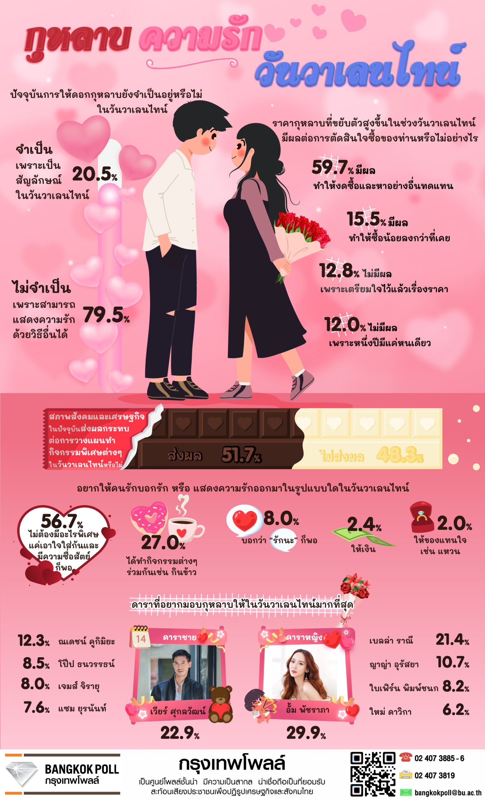 สำหรับ วาเลนไทน์ ปีนี้ ประชาชนอยากมอบดอกกุหลาบให้ดาราคนใดมากสุด พบว่า ดาราชายคือ “เวียร์ ศุกลวัฒน์” ร้อยละ 22.9, ” ณเดชน์ คูกิมิยะ” ร้อยละ 12.3 และ “โป๊ป ธนวรรธน์” ร้อยละ 8.5 ส่วนดาราหญิง ร้อยละ 29.9 “อั้ม พัชราภา” ร้อยละ 21.4 “เบลล่า ราณี” และ ร้อยละ 10.7 “ญาญ่า อุรัสยา”
