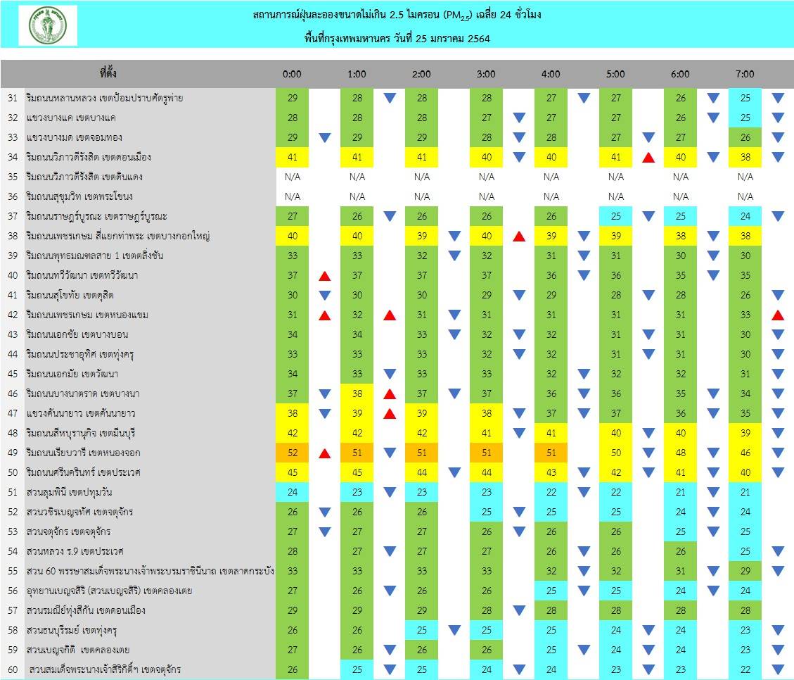 ศูนย์ประสานงานและแก้ไขปัญหามลพิษทางอากาศในกรุงเทพมหานคร  รายงานสถานการณ์ฝุ่นละอองขนาดไม่เกิน 2.5 ไมครอน (PM 2.5) ของสถานีตรวจวัดคุณภาพอากาศของกรุงเทพมหานคร ประจำวันจันทร์ที่ 25 ม.ค. 64 เวลาประมาณ 07.00 น. ค่าเฉลี่ย 24 ชั่วโมง ตรวจวัดได้ 20-46 ไมโครกรัม/ลูกบาศก์เมตร (มคก./ลบ.ม.) พบว่าไม่เกินมาตรฐานทุกพื้นที่ที่มีการตรวจวัด ดัชนีคุณภาพอากาศ ส่วนใหญ่อยู่ในระดับคุณภาพอากาศดี ประชาชนทั่วไปสามารถทำกิจกรรมกลางแจ้งและการท่องเที่ยวได้ตามปกติ