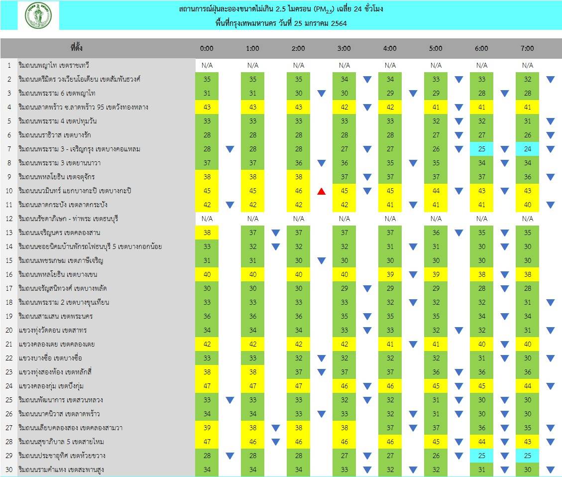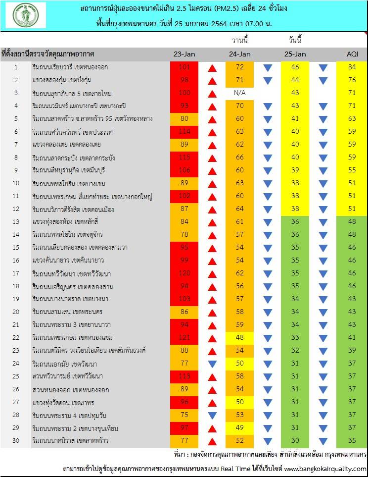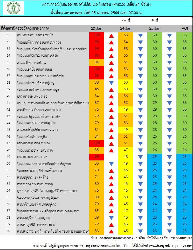 ศูนย์ประสานงานและแก้ไขปัญหามลพิษทางอากาศในกรุงเทพมหานคร  รายงานสถานการณ์ฝุ่นละอองขนาดไม่เกิน 2.5 ไมครอน (PM 2.5) ของสถานีตรวจวัดคุณภาพอากาศของกรุงเทพมหานคร ประจำวันจันทร์ที่ 25 ม.ค. 64 เวลาประมาณ 07.00 น. ค่าเฉลี่ย 24 ชั่วโมง ตรวจวัดได้ 20-46 ไมโครกรัม/ลูกบาศก์เมตร (มคก./ลบ.ม.) พบว่าไม่เกินมาตรฐานทุกพื้นที่ที่มีการตรวจวัด ดัชนีคุณภาพอากาศ ส่วนใหญ่อยู่ในระดับคุณภาพอากาศดี ประชาชนทั่วไปสามารถทำกิจกรรมกลางแจ้งและการท่องเที่ยวได้ตามปกติ
