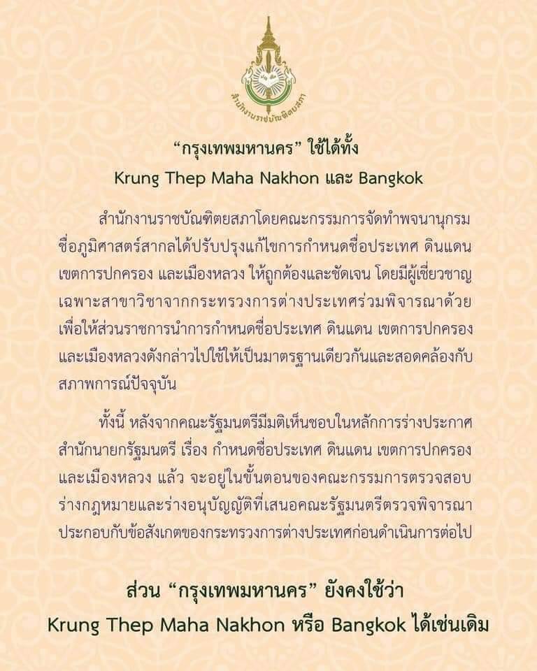เพจเฟซบุ๊กของ “สำนักงานราชบัณฑิตยสภา” เผยแพร่ข้อความระบุ “กรุงเทพมหานคร” ใช้ได้ทั้ง KrungThep Maha Nakhon และ Bangkok สำนักงานราชบัณฑิตยสภาโดยคณะกรรมการจัดทำพจนานุกรมชื่อภูมิศาสตร์สากลได้ปรับปรุงแก้ไขการกำหนดชื่อประเทศ ดินแดน เขตการปกครอง และเมืองหลวง ให้ถูกต้องและชัดเจนโดยมีผู้เชี่ยวชาญเฉพาะสาขาวิชาจากกระทรวงการต่างประเทศร่วมพิจารณาด้วย เพื่อให้ส่วนราชการนำการกำหนดชื่อประเทศ ดินแดน เขตการปกครองและเมืองหลวงดังกล่าวไปใช้ให้เป็นมาตรฐานเดียวกันและสอดคล้องกับสภาพการณ์ปัจจุบัน