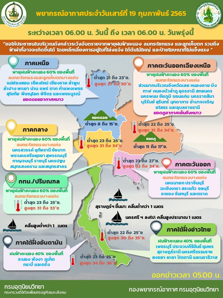 พยากรณ์อากาศ 24 ชั่วโมงข้างหน้า คลื่นกระแสลมฝ่ายตะวันตกจากประเทศเมียนมาจะเคลื่อนเข้าปกคลุมภาคเหนือ และภาคตะวันออกเฉียงเหนือตอนบน ประกอบกับบริเวณความกดอากาศสูงหรือมวลอากาศเย็นจากประเทศจีนได้แผ่ลงมาปกคลุมประเทศเวียดนามตอนบนแล้ว คาดว่าจะแผ่ลงมาปกคลุมภาคตะวันออกเฉียงเหนือ และทะเลจีนใต้ในวันนี้ (19 ก.พ. 2565) ส่งผลทำให้มีลมใต้และลมตะวันออกเฉียงใต้พัดนำความชื้นจากทะเลจีนใต้ และอ่าวไทยเข้ามาปกคลุมประเทศไทยตอนบน ลักษณะเช่นนี้ทำให้บริเวณดังกล่าวจะมีลักษณะอากาศแปรปรวน โดยมีพายุฝนฟ้าคะนอง ลมกระโชกแรง และลูกเห็บตกบางแห่ง ขอให้ประชาชนในบริเวณดังกล่าวระวังอันตรายจากพายุฝนฟ้าคะนอง ลมกระโชกแรง และลูกเห็บตก รวมถึงฟ้าผ่าที่อาจจะเกิดขึ้นได้ โดยหลีกเลี่ยงการอยู่ในที่โล่งแจ้ง ใต้ต้นไม้ใหญ่ และป้ายโฆษณาที่ไม่แข็งแรง สำหรับเกษตรกรควรเตรียมการป้องกันและระวังความเสียหายที่จะเกิดต่อผลผลิตทางการเกษตรไว้ด้วย