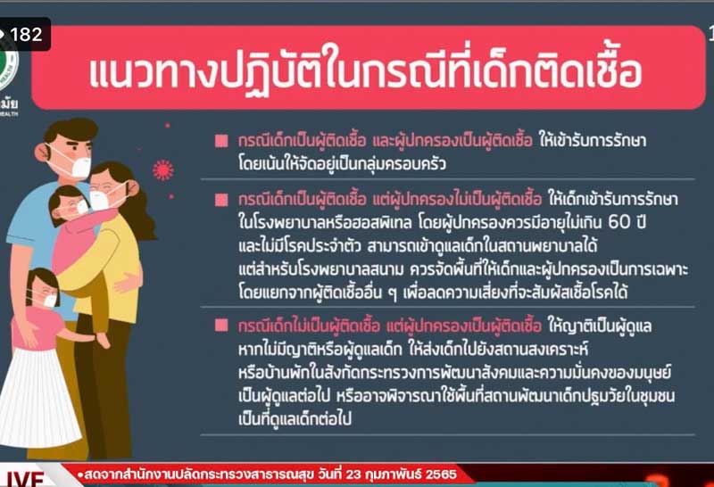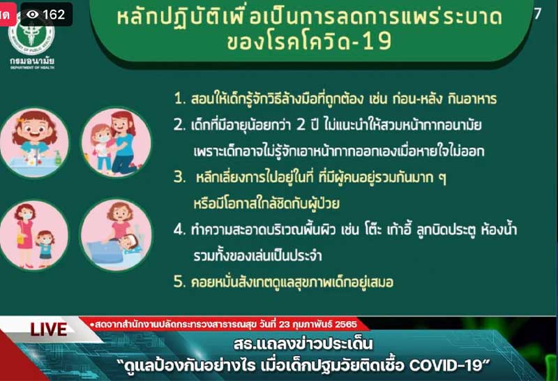 วันนี้ (23 ก.พ. 65) ที่กระทรวงสาธารณสุข นพ.เอกชัย เพียรศรีวัชรา รองอธิบดีกรมอนามัย พร้อมด้วย นพ.ธีรชัย บุญยะลีพรรณ รองผู้อำนวยการสถาบันพัฒนาอนามัยเด็กแห่งชาติ กรมอนามัย ร่วมแถลงการณ์ประเด็น ดูแลป้องกันอย่างไรเมื่อเด็กปฐมวัยติดเชื้อ Covid-19 เนื่องจากการติดเชื้อที่เพิ่มขึ้นของเด็กวัยประถม