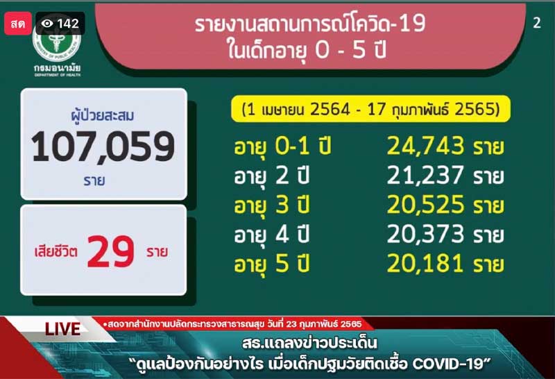 นพ.เอกชัย กล่าวว่าในกลุ่มเด็ก 0-5 ปีที่ติดเชื้อโควิด-19ในช่วง 7 วันที่ผ่านมามีจำนวนสูงถึง 6 พันกว่ารายซึ่งมีแนวโน้มเพิ่มขึ้นเมื่อดูย้อนหลังตั้งแต่วันที่ 1 เม.ย. 64 – 17 ก.พ. 65 พบว่ามีเด็กวัยดังกล่าวติดเชื้อสะสม107,059 ราย เสียชีวิต 29 ราย ซึ่งส่วนใหญ่ที่เสียชีวิตจะเป็นเด็กที่มีโรคประจำตัว โดยสาเหตุหลักมาจากการสัมผัสใกล้ชิดกับผู้ป่วยติดเชื้อในครอบครัว และการละเลยการดูแลสุขอนามัยสำหรับเด็ก