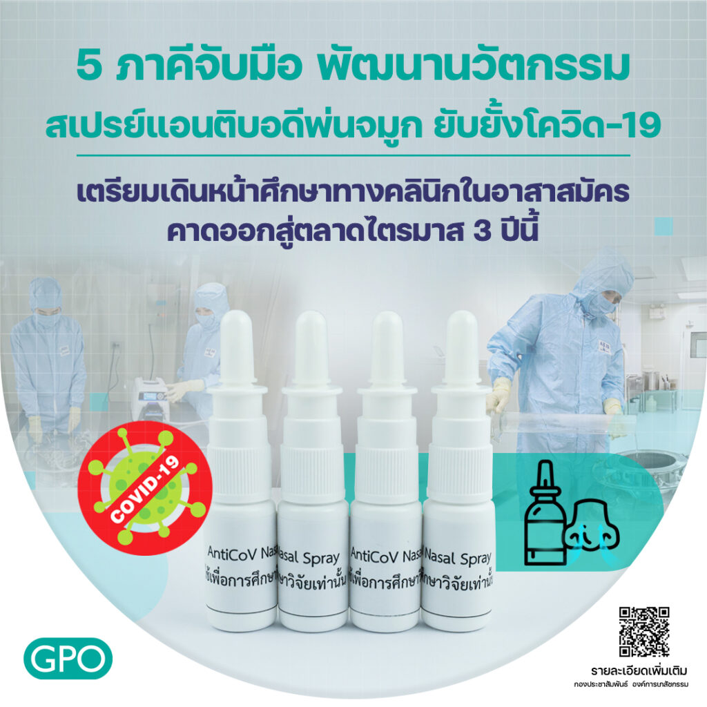 โดยการผนึกกำลังครั้งสำคัญนี้ เพื่อผลักดันงานวิจัยและพัฒนานวัตกรรมไทยสู่ระดับโลก นวัตกรรม “สเปรย์แอนติบอดีพ่นจมูกที่มีคุณสมบัติยับยั้งเชื้อ โควิด -19” ได้ผ่านการทดสอบเบื้องต้นในสัตว์ทดลองได้ผลเป็นที่น่าพอใจและเตรียมเดินหน้าสู่การศึกษาทางคลินิกในอาสาสมัครภายในไตรมาสแรกของปีนี้ จากนั้นนำผลการศึกษายื่นขอขึ้นทะเบียนต่อสำนักงานคณะกรรมการอาหารและยา (อย.) ประมาณเดือนมิถุนายน 2565 คาดออกสู่ตลาดเพื่อให้ประชาชนไทยได้เข้าถึงนวัตกรรมสุขภาพอีกทางเลือกหนึ่งในการป้องกันเชื้อโควิด-19 ประมาณไตรมาส 3 ของปี 2565
