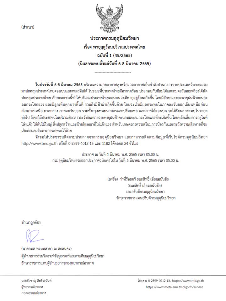 กรมอุตุนิยมวิทยาจะออกประกาศฉบับต่อไปใน วันที่ 5 มีนาคม พ.ศ. 2565 เวลา 05.00 น.