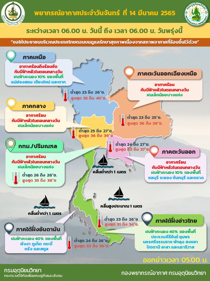 พยากรณ์อากาศ ประจำวันที่ 14 มีนาคม 2565 24 ลักษณะอากาศทั่วไป ชั่วโมงข้างหน้า ความกดอากาศต่ำเนื่องจากความร้อนปกคลุมประเทศไทยตอนบน ทำให้ประเทศไทยตอนบนมีอากาศร้อนกับมีฟ้าหลัวในตอนกลางวัน และมีอากาศร้อนจัดบางพื้นที่ ในขณะที่ลมใต้และลมตะวันออกเฉียงใต้กำลังอ่อนพัดปกคลุมภาคเหนือตอนล่าง ภาคตะวันออกเฉียงเหนือตอนล่าง ภาคกลาง และภาคตะวันออก ทำให้บริเวณดังกล่าวมีฝนฟ้าคะนองบางแห่ง ขอให้ประชาชนบริเวณประเทศไทยตอนบนดูแลรักษาสุขภาพเนื่องจากสภาพอากาศที่ร้อนขึ้นไว้ด้วย