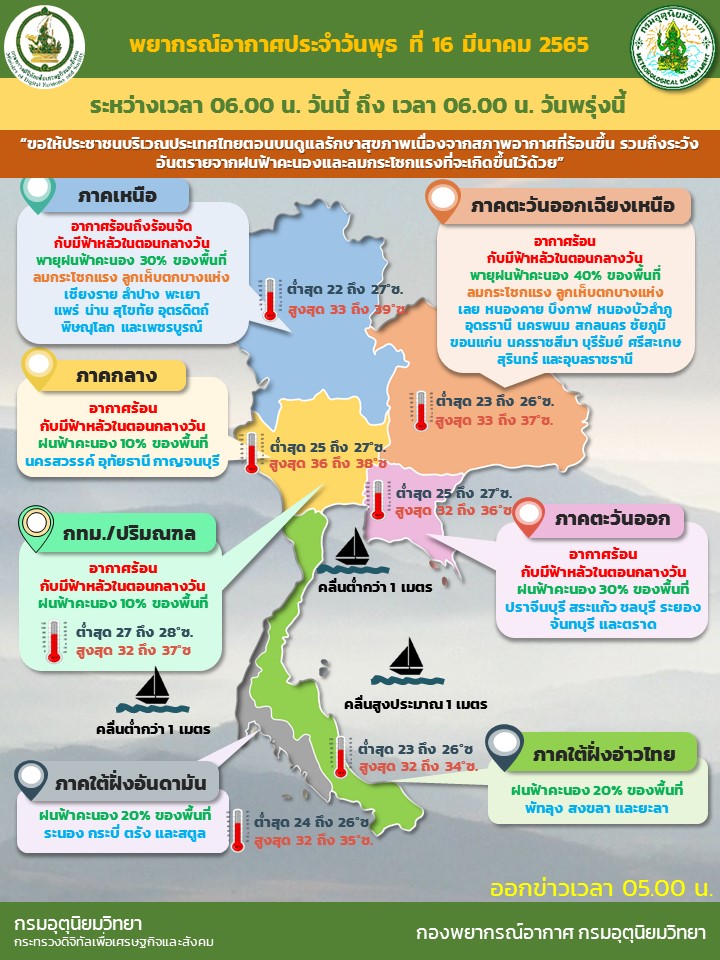พยากรณ์อากาศ ประจำวันที่ 16 มีนาคม 2565 ลักษณะอากาศทั่วไป 24 ชั่วโมงข้างหน้า ภาคเหนือและภาคตะวันออกเฉียงเหนือตอนบน มีพายุฝนฟ้าคะนอง ลมกระโชกแรงและลูกเห็บตกบางแห่ง เนื่องจากมีคลื่นกระแสลมฝ่ายตะวันตกเคลื่อนเข้าปกคลุมบริเวณดังกล่าว