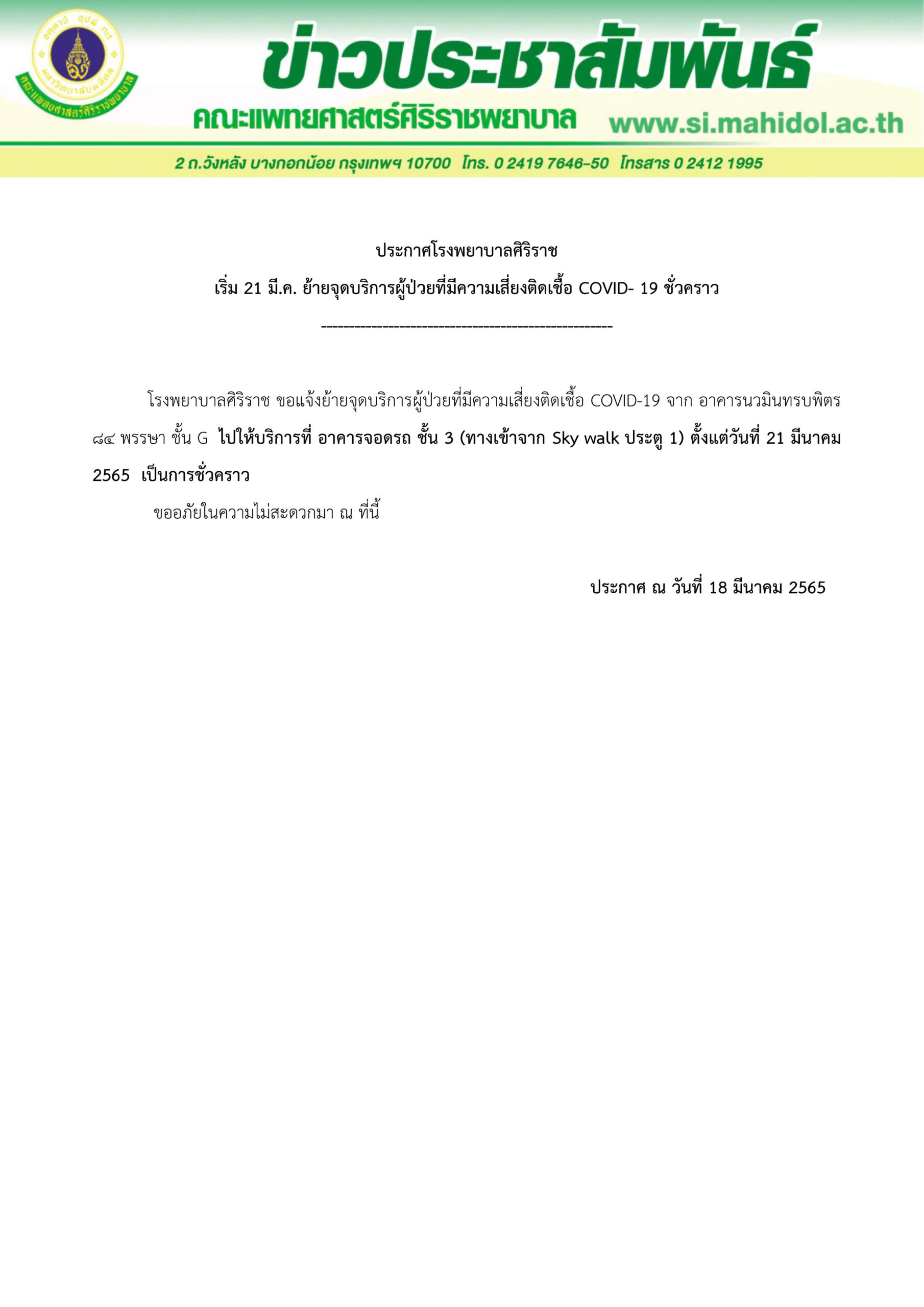 โรงพยาบาลศิริราช ประกาศขอแจ้งย้ายจุดบริการผู้ป่วยที่มีความเสี่ยงติดเชื้อ COVID-19 จาก อาคารนวมินทรบพิตร 84 พรรษา ชั้น G ไปให้บริการที่ อาคารจอดรถ ชั้น 3 (ทางเข้าจาก Sky walk ประตู 1) ตั้งแต่วันที่ 21 มีนาคม 2565 เป็นการชั่วคราว