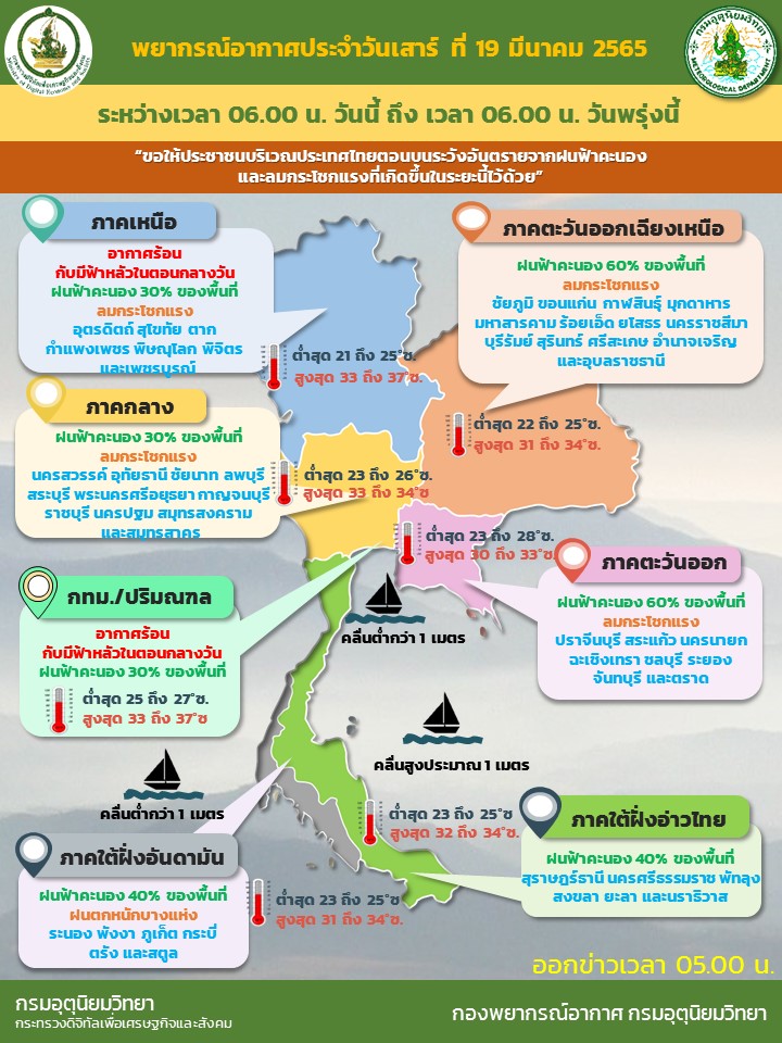 ในขณะที่ลมใต้และลมตะวันออกเฉียงใต้ยังคงพัดปกคลุมภาคเหนือตอนล่าง ภาคตะวันออกเฉียงเหนือ ภาคกลาง รวมทั้งกรุงเทพมหานครและปริมณฑล และภาคตะวันออก ทำให้บริเวณดังกล่าวมีฝนฟ้าคะนองกับมีลมกระโชกแรงเกิดขึ้นได้ ขอให้ประชาชนบริเวณประเทศไทยตอนบนระวังอันตรายจากฝนฟ้าคะนองและลมกระโชกแรงที่เกิดขึ้นในระยะนี้ไว้ด้วย
