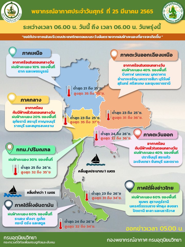พยากรณ์อากาศ ประจำ วันที่ 25 มีนาคม 2565 ลักษณะอากาศทั่วไป24 ชั่วโมงข้างหน้า หย่อมความกดอากาศต่ำเนื่องจากความร้อนปกคลุมภาคเหนือตอนบน ทำให้ประเทศไทยตอนบนมีอุณหภูมิสูงขึ้น โดยมีอากาศร้อนกับมีฟ้าหลัวในตอนกลางวัน ประกอบกับลมใต้และลมตะวันออกเฉียงใต้ที่พัดปกคลุมภาคเหนือตอนล่าง ภาคตะวันออกเฉียงเหนือ ภาคกลาง รวมทั้งกรุงเทพมหานครและปริมณฑล และภาคตะวันออกมีกำลังอ่อนลง ทำให้ประเทศไทยตอนบนมีฝนลดลง แต่ยังคงมีฝนฟ้าคะนองบางแห่ง จึงขอให้ประชาชนในบริเวณดังกล่าวระวังอันตรายจากฝนฟ้าคะนองที่เกิดขึ้นในระยะนี้ไว้ด้วย สำหรับลมตะวันออกและลมตะวันออกเฉียงใต้ยังคงพัดปกคลุมทะเลอันดามัน ภาคใต้ และอ่าวไทย ทำให้ภาคใต้มีฝนฟ้าคะนองในระยะนี้