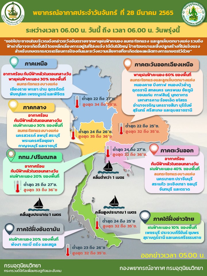 ประกอบกับประเทศไทยตอนบนมีอากาศร้อน ทำให้บริเวณดังกล่าวมีพายุฤดูร้อนเกิดขึ้น โดยจะเริ่มบริเวณภาคตะวันออกเฉียงเหนือก่อน ส่วนภาคเหนือ ภาคกลาง และภาคตะวันออก จะได้รับผลกระทบในวันนี้ (28 มี.ค. 65) ซึ่งจะมีลักษณะของพายุฝนฟ้าคะนอง ลมกระโชกแรง และลูกเห็บตกบางแห่ง รวมถึงฟ้าผ่าที่อาจเกิดขึ้นได้บางพื้นที่ ขอให้ประชาชนระวังอันตรายจากภัยดังกล่าว โดยหลีกเลี่ยงการอยู่ในที่โล่งแจ้ง ใต้ต้นไม้ใหญ่ ป้ายโฆษณาและสิ่งปลูกสร้างที่ไม่แข็งแรง เกษตรกรควรเตรียมการป้องกันและระวังความเสียหายที่จะเกิดต่อผลผลิตทางการเกษตรไว้ด้วย