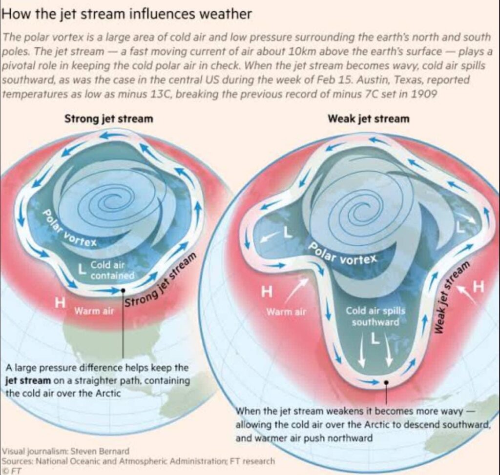 น้ำแข็งขั้วโลกละลาย ทำให้กระแสลมที่เคยพัดวนทวนเข็มนาฬิกาด้วยความเร็วเฉลี่ย 50กิโลเมตรต่อชั่วโมง ที่ปกติหมุนพัดที่ความสูง 10กิโลเมตรจากพื้นดินรอบเขตขั้วโลกมานับล้านปีเกิดสะดุดกำแพงลมนี้เป็นเสมือนปราการธรรมชาติที่เคยขังไอเย็นไว้ในขั้วโลก บัดนี้เริ่มมีจุดที่มันยืดย้วยออกเป็นห้วงๆ เพราะไออุ่นจากมหาสมุทรและแผ่นดินทวีปบางย่านที่มากขึ้นลอย ไปกระทบกำแพงลม ทำให้ลมหมุนถูกเบี่ยงเบน อ้อมออกจากเส้นทางเดิมๆ ทีนี้ไอเย็นก็ขยายออกตามลงมา แล้วแต่ว่ารอยยืดนั้นไปเกิดในจุดไหน พอจุดนั้นยืดย้วย ก็จะดันเอาอากาศชุดที่ติดกับมันให้ดันกันต่อไปสู่เขตอื่น แม้แต่เขตอากาศของเส้นศูนย์สูตร