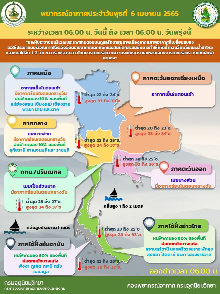 พยากรณ์อากาศ 24 ชั่วโมงข้างหน้า ลมตะวันออกและลมตะวันออกเฉียงเหนือกำลังปานกลางที่พัดปกคลุมอ่าวไทยและภาคใต้เริ่มมีกำลังอ่อนลง แต่ยังคงทำให้ภาคใต้มีฝนตกหนักบางแห่ง ขอให้ประชาชนบริเวณภาคใต้ระวังอันตรายจากฝนตกหนักและฝนที่ตกสะสมซึ่งอาจทำให้เกิดน้ำท่วมฉับพลันและน้ำป่าไหลหลากต่อไปอีก 1-2 วัน ส่วนคลื่นลมบริเวณอ่าวไทยมีกำลังปานกลาง โดยอ่าวไทยคลื่นสูง 1-2 เมตร บริเวณที่มีฝนฟ้าคะนองคลื่นสูงมากกว่า 2 เมตร ชาวเรือบริเวณอ่าวไทยควรเดินเรือด้วยความระมัดระวัง และหลีกเลี่ยงการเดินเรือบริเวณที่มีฝนฟ้าคะนอง