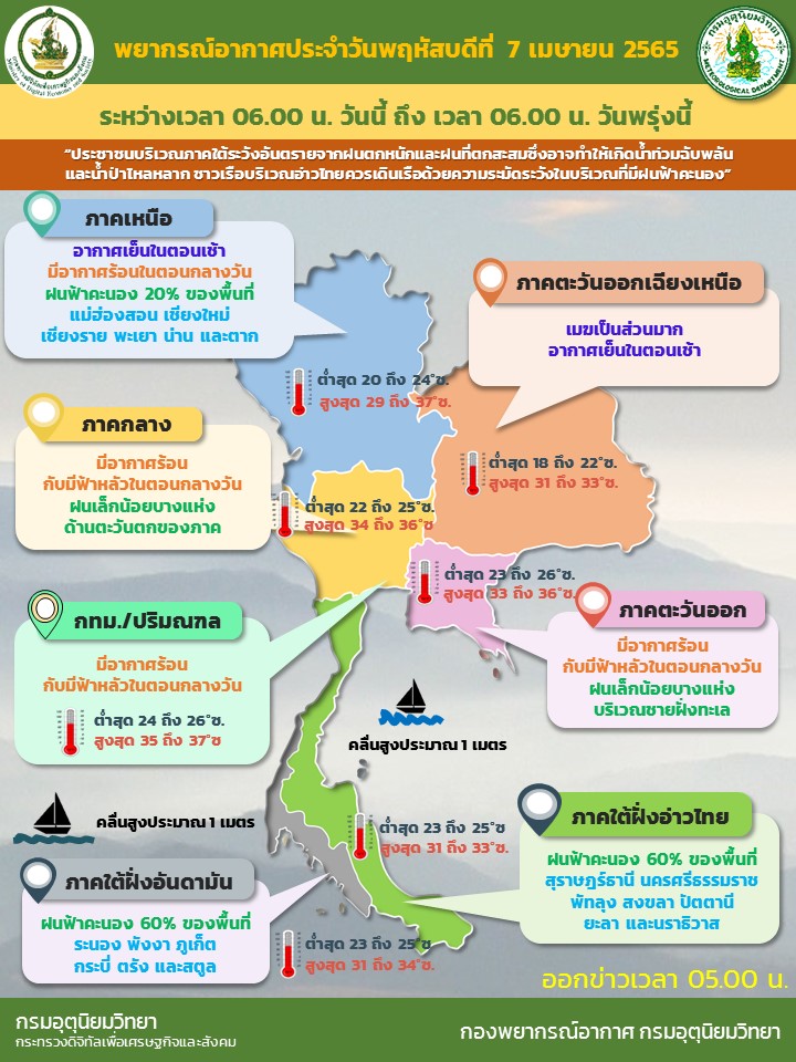 พยากรณ์อากาศ ประจำวันที่ 7 เม.ย. 2565 ลักษณะอากาศทั่วไป 24 ชั่วโมงข้างหน้า ลมตะวันออกและลมตะวันออกเฉียงเหนือกำลังปานกลางที่พัดปกคลุมอ่าวไทยและภาคใต้มีกำลังอ่อนลง แต่ยังคงทำให้ภาคใต้มีฝนฟ้าคะนอง ขอให้ประชาชนบริเวณภาคใต้ระวังอันตรายจากฝนตกสะสมซึ่งอาจทำให้เกิดน้ำท่วมฉับพลันและน้ำป่าไหลหลาก ส่วนคลื่นลมบริเวณอ่าวไทยมีกำลังอ่อน โดยอ่าวไทยมีคลื่นสูงประมาณ 1 เมตร บริเวณที่มีฝนฟ้าคะนองคลื่นสูงมากกว่า 1 เมตร ชาวเรือในบริเวณดังกล่าวควรเดินเรือด้วยความระมัดระวังบริเวณที่มีฝนฟ้าคะนอง