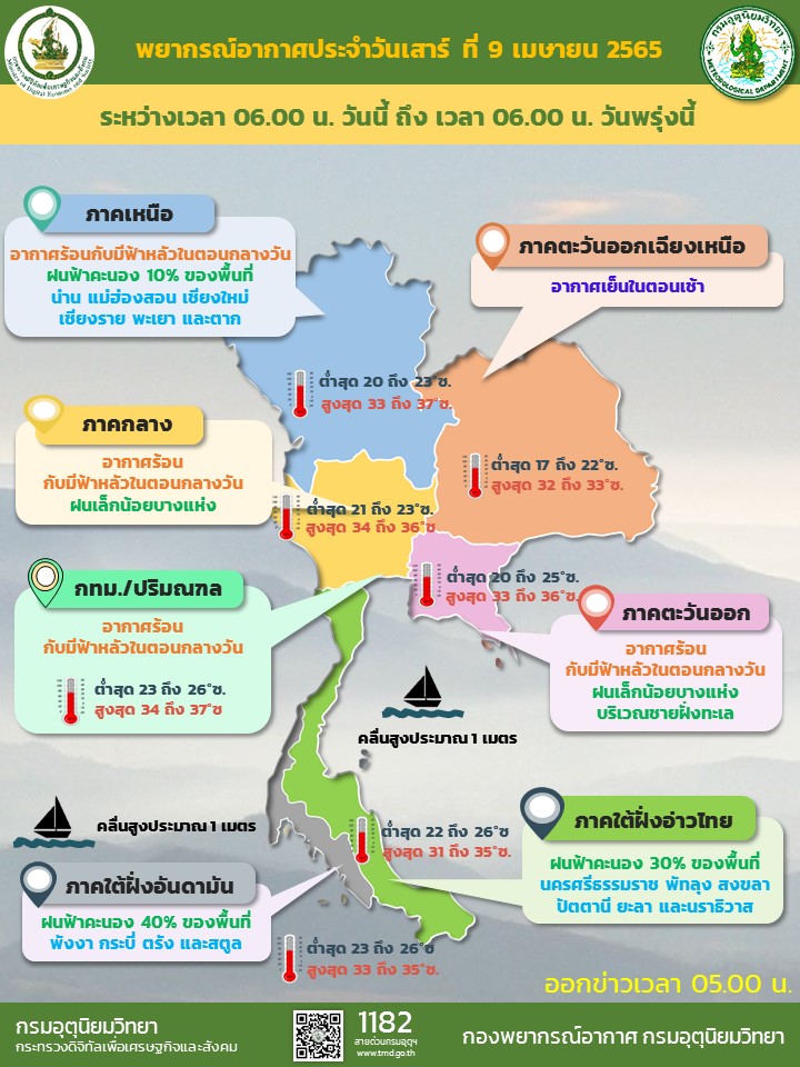 พยากรณ์อากาศ 24 ชั่วโมงข้างหน้า ความกดอากาศต่ำเนื่องจากความร้อนปกคลุมด้านตะวันตกของประเทศไทย ทำให้ประเทศไทยตอนบนมีอุณหภูมิสูงขึ้น โดยมีอากาศร้อนกับมีฟ้าหลัวในตอนกลางวันในบริเวณภาคเหนือ ภาคกลางรวมทั้งกรุงเทพมหานครและปริมณฑล และภาคตะวันออก ประกอบกับบริเวณความกดอากาศสูงกำลังอ่อนปกคลุมภาคเหนือตอนบน และภาคตะวันออกเฉียงเหนือของประเทศไทย โดยมีลมตะวันออกและลมตะวันออกเฉียงเหนือพัดปกคลุมประเทศไทยตอนบน ทำให้บริเวณดังกล่าวยังคงมีอากาศเย็นในตอนเช้า