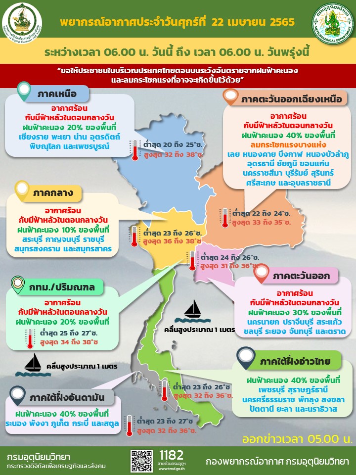 พยากรณ์อากาศประจำวันที่ 22 เมษายน 2565 ลักษณะอากาศทั่วไป 24 ชั่วโมงข้างหน้า คลื่นกระแสลมฝ่ายตะวันตกเคลื่อนผ่านภาคเหนือ เข้ามาปกคลุมภาคตะวันออกเฉียงเหนือตอนบนของประเทศไทย และประเทศลาวตอนบน ประกอบกับมีลมใต้และลมตะวันออกเฉียงใต้พัดนำความชื้นจากอ่าวไทยเข้ามาปกคลุมบริเวณภาคตะวันออกเฉียงเหนือตอนล่าง ภาคกลาง และภาคตะวันออก ทำให้บริเวณภาคเหนือ ภาคตะวันออกเฉียงเหนือ ภาคกลาง และภาคตะวันออก มีฝนฟ้าคะนองบางพื้นที่ ขอให้ประชาชนในบริเวณดังกล่าวระวังอันตรายจากฝนฟ้าคะนองที่อาจจะเกิดขึ้นไว้ด้วย ในขณะที่ความกดอากาศต่ำเนื่องจากความร้อนปกคลุมประเทศไทยตอนบน ทำให้บริเวณดังกล่าวมีอากาศร้อนกับมีฟ้าหลัวในตอนกลางวัน