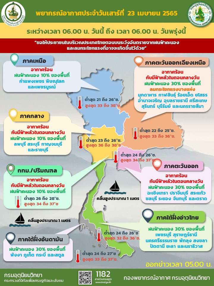 พยากรณ์อากาศ ประจำวันที่ 23 เมษายน 2565 24 ลักษณะอากาศทั่วไป ชั่วโมงข้างหน้า ความกดอากาศต่ำเนื่องจากความร้อนปกคลุมประเทศไทยตอนบน ทำให้ประเทศไทยตอนบนมีอากาศร้อนโดยทั่วไปประกอบกับมีลมใต้และลมตะวันออกเฉียงใต้พัดนำความชื้นจากอ่าวไทยเข้ามาปกคลุมภาคตะวันออกเฉียงเหนือตอนล่าง ภาคกลาง และภาคตะวันออก ทำให้ภาคเหนือตอนล่าง ภาคตะวันออกเฉียงเหนือ ภาคกลาง และภาคตะวันออก มีฝนฟ้าคะนองบางพื้นที่ ขอให้ประชาชนในบริเวณดังกล่าวระวังอันตรายจากฝนฟ้าคะนองที่อาจจะเกิดขึ้น สำหรับลมตะวันออกและลมตะวันออกเฉียงใต้พัดปกคลุมทะเลอันดามัน ภาคใต้ และอ่าวไทย ทำให้ภาคใต้ยังคงมีฝนฟ้าคะนองเกิดขึ้นได้