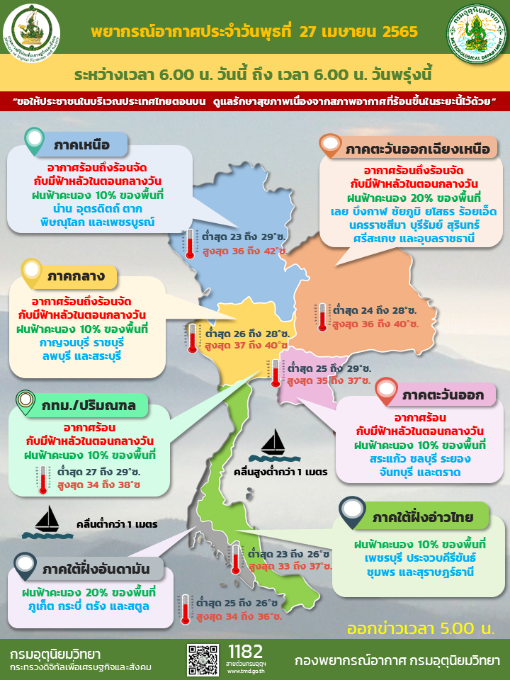 พยากรณ์อากาศ ประจำ วันที่ 27 เมษายน 2565 ลักษณะอากาศทั่วไป 24 ชั่วโมงข้างหน้า ความกดอากาศต่ำเนื่องจากความร้อนปกคลุมประเทศไทยตอนบน ลักษณะเช่นนี้ทำให้บริเวณดังกล่าวมีอากาศร้อนโดยทั่วไปกับมีฟ้าหลัวในตอนกลางวัน และมีอากาศร้อนจัดบางพื้นที่ในภาคเหนือ ภาคตะวันออกเฉียงเหนือ และภาคกลาง ขอให้ประชาชนดูแลสุขภาพเนื่องจากสภาพอากาศที่ร้อนขึ้นในระยะนี้ไว้ด้วย สำหรับลมใต้และลมตะวันออกเฉียงใต้ยังคงพัดนำความชื้นจากอ่าวไทยเข้ามาปกคลุมภาคเหนือตอนล่าง ภาคตะวันออกเฉียงเหนือ ภาคกลาง และภาคตะวันออก ทำให้ประเทศไทยตอนบนยังคงมีฝนฟ้าคะนองบางแห่ง ส่วนลมตะวันตกพัดปกคลุมทะเลอันดามัน ภาคใต้ และอ่าวไทย ทำให้ภาคใต้มีฝนฟ้าคะนองบางแห่ง