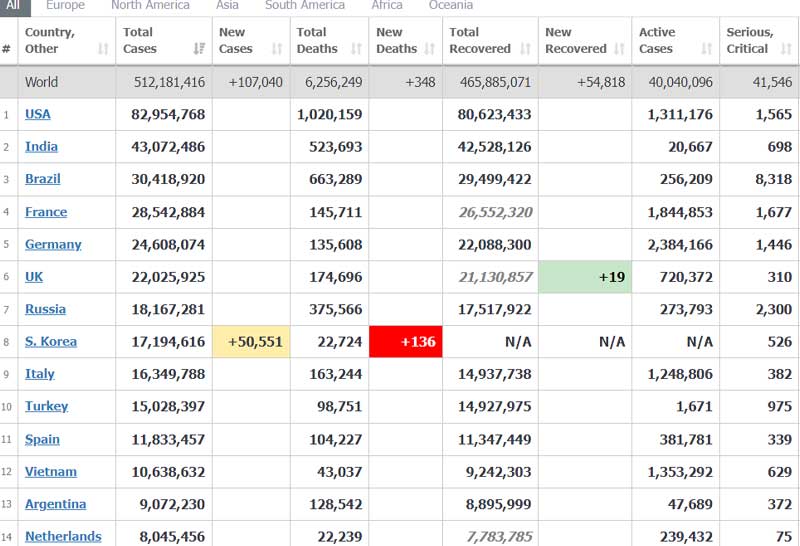 ทั่วโลกติดเชื้อโควิดกว่า 512 ล้านราย เพิ่ม 6.2แสนราย เยอรมนี ป่วยพุ่งอีก 1.1แสนราย ต่อวัน