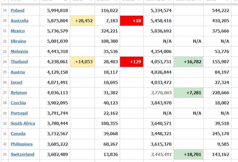 สำหรับประเทศไทย อยู่ลำดับที่ 24 พบผู้ติดเชื้อแล้ว 4,224,008 ราย เพิ่มขึ้น 14,437 ราย เสียชีวิต 28,274 ราย เพิ่มขึ้น 127 ราย รักษาหาย 4,036,969 ราย เพิ่มขึ้น 18,509 ราย