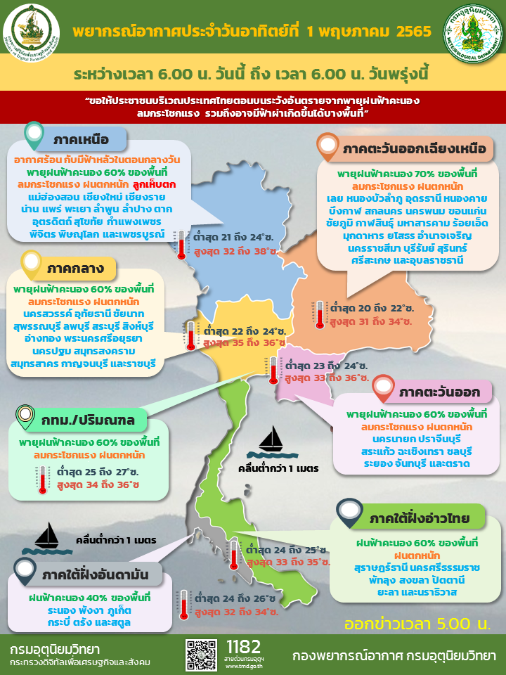 พยากรณ์อากาศประจำวันที่ 1 พฤษภาคม 2565 ลักษณะอากาศทั่วไป 24 ชั่วโมงข้างหน้า บริเวณความกดอากาศสูงหรือมวลอากาศเย็นกำลังปานกลางจากประเทศจีนได้เคลื่อนลงมาปกคลุมประเทศเวียดนามตอนบนแล้ว คาดว่าจะเคลื่อนเข้าปกคลุมภาคตะวันออกเฉียงเหนือของประเทศไทยและทะเลจีนใต้ในวันนี้ ในขณะที่ประเทศไทยตอนบนมีอากาศร้อน ประกอบกับมีลมใต้และลมตะวันออกเฉียงใต้พัดนำความชื้นจากทะเลจีนใต้และอ่าวไทยเข้ามาปกคลุมบริเวณดังกล่าว ลักษณะเช่นนี้จะทำให้ประเทศไทยตอนบนมีพายุฝนฟ้าคะนอง ลมกระโชกแรง ลูกเห็บตก รวมถึงอาจมีฟ้าผ่าเกิดขึ้นได้ ขอให้ประชาชนระวังอันตรายจากภัยดังกล่าว