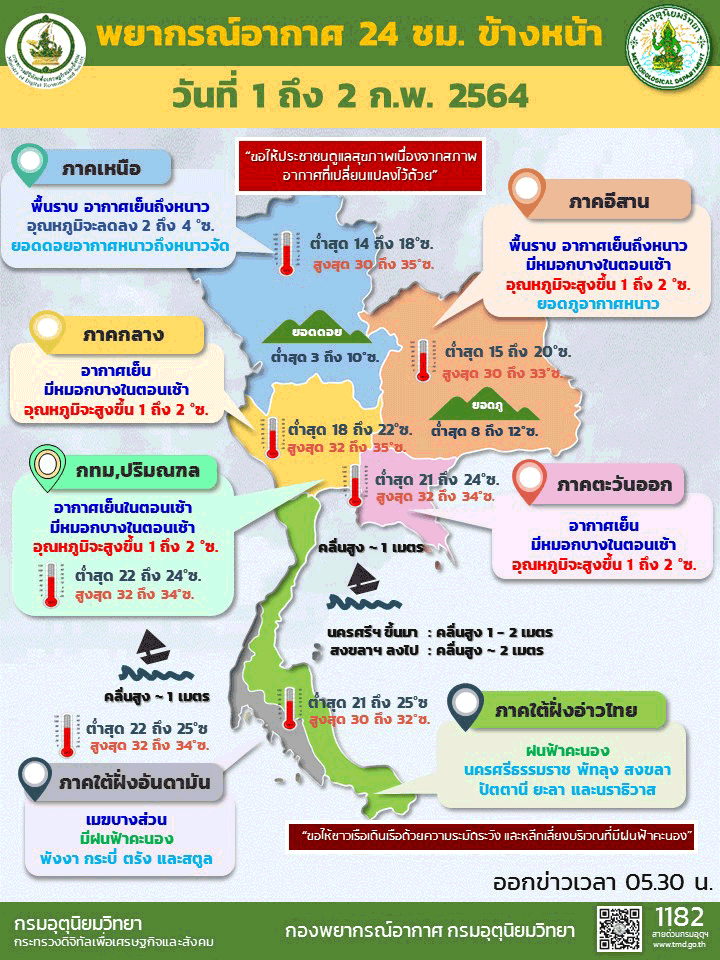 กรมอุตุนิยมวิทยา พยากรณ์อากาศ 24 ชั่วโมงข้างหน้า บริเวณความกดอากาศสูงหรือมวลอากาศเย็นกำลังปานกลางที่ปกคลุมภาคตะวันออกเฉียงเหนือ ภาคกลาง ภาคตะวันออก รวมทั้งกรุงเทพมหานครและปริมณฑล มีกำลังอ่อนลง ทำให้บริเวณดังกล่าวมีอุณหภูมิสูงขึ้น 1-2 องศาเซลเซียส แต่ยังคงมีอากาศเย็นกับมีหมอกบางในตอนเช้า ในขณะที่ลมฝ่ายตะวันตกในระดับบนพัดปกคลุมภาคเหนือ ลักษณะเช่นนี้จะทำให้ภาคเหนือตอนบนมีอุณหภูมิลดลง 2-4 องศาเซลเซียส ขอให้ประชาชนดูแลสุขภาพเนื่องจากสภาพอากาศที่เปลี่ยนแปลงไว้ด้วย สำหรับมรสุมตะวันออกเฉียงเหนือที่พัดปกคลุมอ่าวไทยและภาคใต้จะมีกำลังปานกลาง ทำให้คลื่นลมบริเวณอ่าวไทยตอนล่างตั้งแต่จังหวัดสงขลาลงไป ทะเลมีคลื่นสูงประมาณ 2 เมตร บริเวณที่มีฝนฟ้าคะนองคลื่นสูงมากกว่า 2 เมตร ขอให้ชาวเรือเดินเรือด้วยความระมัดระวัง และหลีกเลี่ยงบริเวณที่มีฝนฟ้าคะนอง