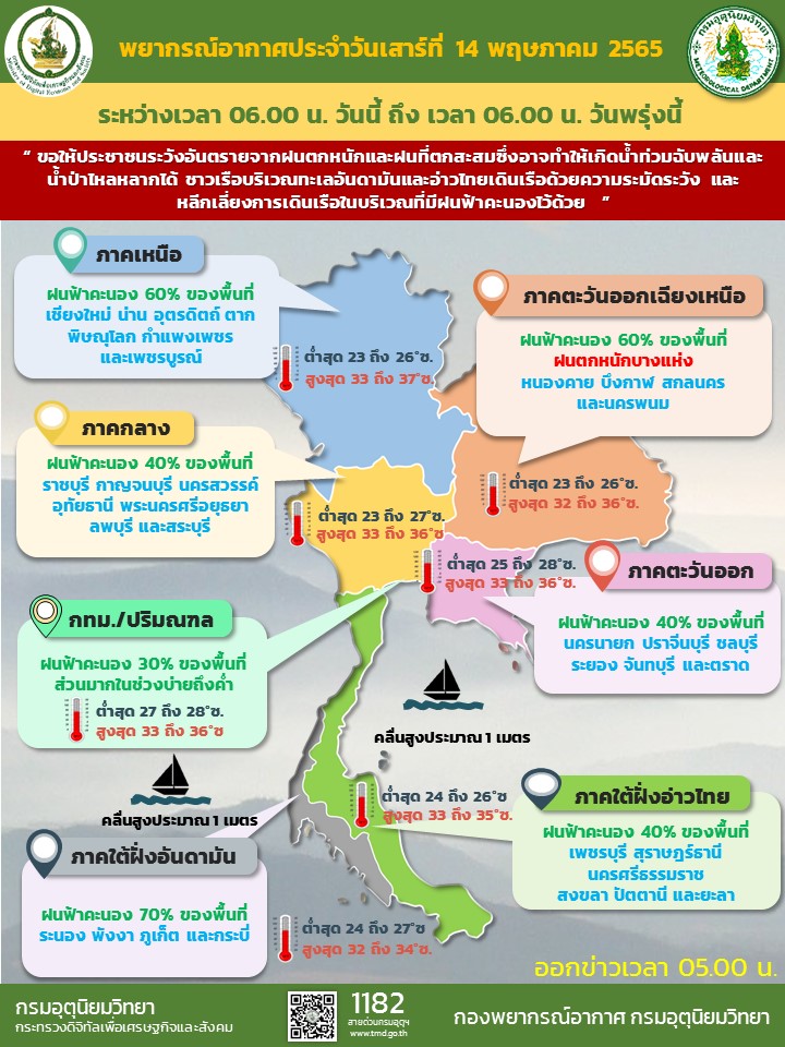 ในช่วงวันที่ 15 – 17 พฤษภาคม 2565 มรสุมตะวันตกเฉียงใต้กำลังปานกลางพัดปกคลุมทะเลอันดามัน ประเทศไทย และอ่าวไทย ประกอบกับบริเวณความกดอากาศสูงหรือมวลอากาศเย็นจากประเทศจีนจะแผ่ลงมาปกคลุมภาคตะวันออกเฉียงเหนือและทะเลจีนใต้ ลักษณะเช่นนี้ทำให้บริเวณประเทศไทยตอนบนจะมีฝนฟ้าคะนองเพิ่มขึ้น กับมีลมกระโชกแรง และมีฝนตกหนักถึงหนักมากบางแห่งบริเวณภาคเหนือ ภาคตะวันออกเฉียงเหนือ ภาคกลาง ภาคตะวันออก รวมทั้งกรุงเทพมหานครและปริมณฑล ขอให้ประชาชนระวังอันตรายจากฝนตกหนักและฝนที่ตกสะสม