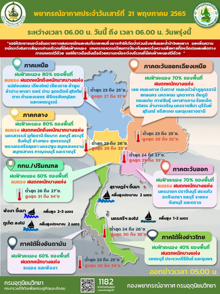 หย่อมความกดอากาศต่ำกำลังแรงบริเวณประเทศเมียนมา ได้เคลื่อนเข้าปกคลุมบริเวณจังหวัดแม่ฮ่องสอนของประเทศไทยแล้ว คาดว่าจะเคลื่อนผ่านภาคเหนือและภาคตะวันออกเฉียงเหนือตอนบนในช่วงวันที่ 21-23 พฤษภาคม 2565 ประกอบกับมีร่องมรสุมพาดผ่านภาคเหนือ ภาคกลางตอนบน และภาคตะวันออกเฉียงเหนือ ในขณะที่มรสุมตะวันตกเฉียงใต้กำลังแรงพัดปกคลุมประเทศไทย ทะเลอันดามัน และอ่าวไทย ลักษณะเช่นนี้ทำให้ประเทศไทยตอนบนมีฝนฟ้าคะนองกับมีลมแรง