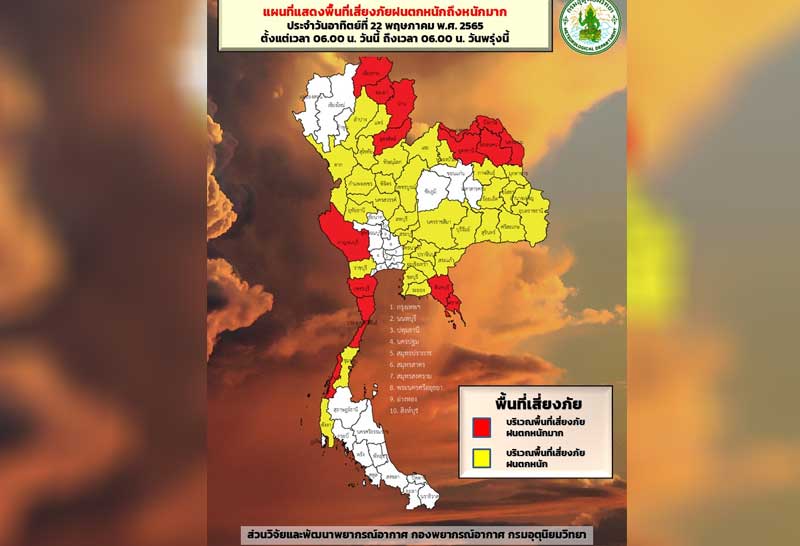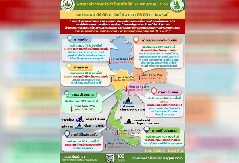 พยากรณ์อาการประจำวันที่ 22 พฤษภาคม 2565 พยากรณ์อากาศ 24 ชั่วโมงข้างหน้า ประเทศไทยมีฝนฟ้าคะนองกับมีฝนตกหนักถึงหนักมากบางแห่งในภาคเหนือ ภาคตะวันออกเฉียงเหนือ ภาคกลาง ภาคตะวันออก และภาคใต้ตอนบน