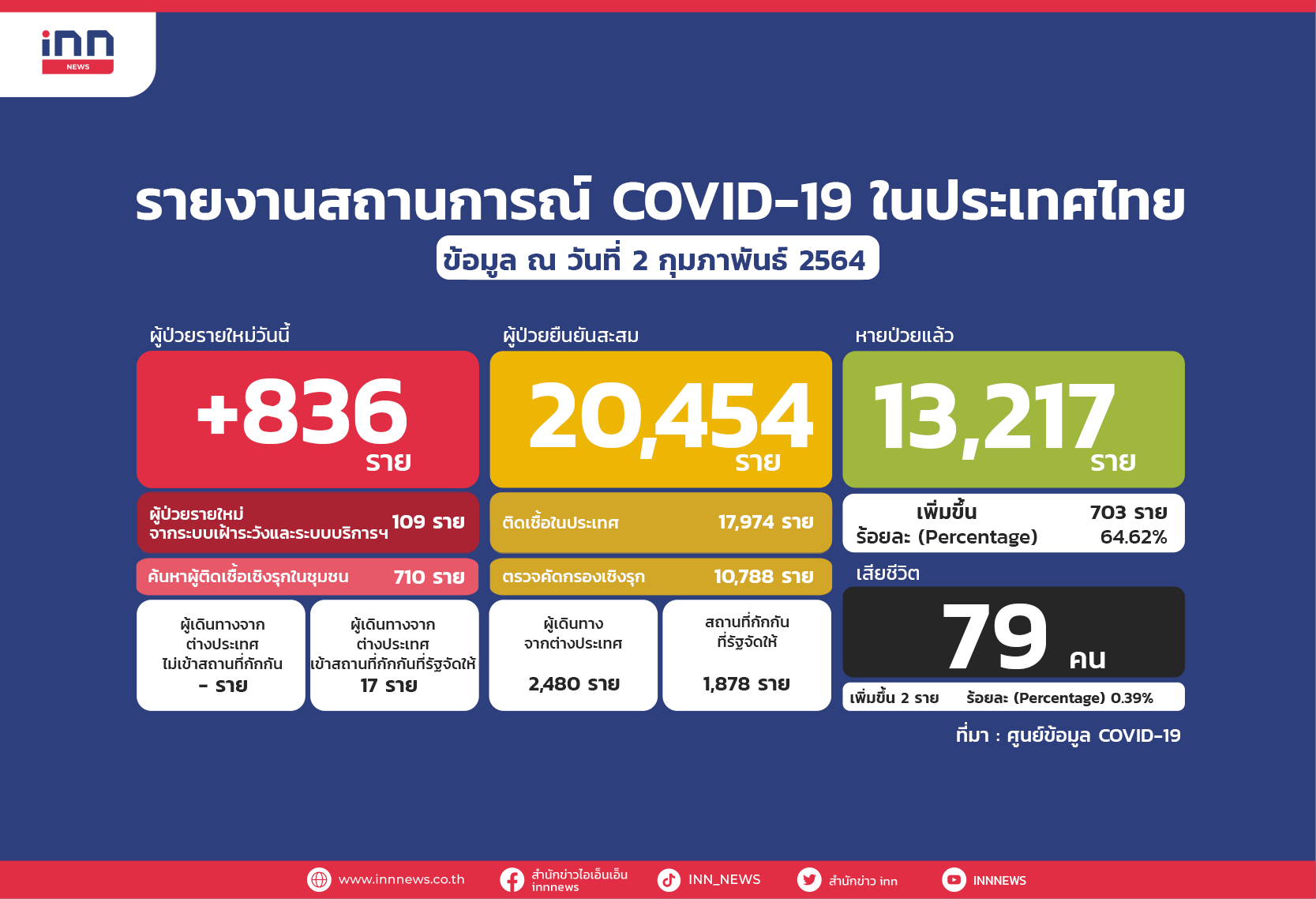 นายแพทย์ทวีศิลป์ วิษณุโยธิน โฆษกศูนย์บริหารสถานการณ์โควิด -19 หรือ ศบค. แถลงสถานการณ์ประจำวันอังคาร ที่ 2 กุมภาพันธ์ 2564 ประเทศไทยอยู่ในอันดับที่ 116 ของโลก พบผู้ติดเชื้อรายใหม่ 836 ราย พบผู้ป่วยยืนยันสะสม 20,454 ราย รักษาหายกลับบ้านแล้ว 13,217 ราย รักษาอยู่ 7,158 ราย เสียชีวิตใหม่ 2 ราย รวม 79 คน