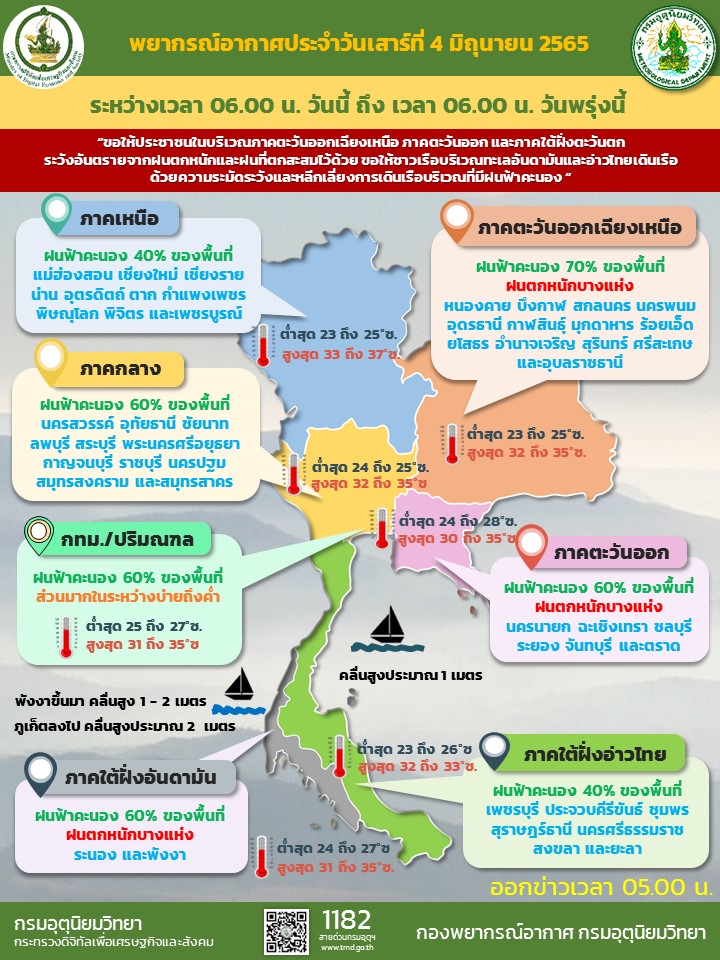 พยากรณ์อากาศ ประจำวันที่ 4 มิถุนายน 2565 ลักษณะอากาศ 24 ชั่วโมงข้างหน้า มรสุมตะวันตกเฉียงใต้กำลังปานกลางพัดปกคลุมทะเลอันดามัน ประเทศไทยและอ่าวไทย ในขณะที่มีหย่อมความกดอากาศต่ำปกคลุมบริเวณประเทศเวียดนามตอนบนและประเทศจีนตอนใต้ลักษณะเช่นนี้ทำให้ประเทศไทยยังคงมีฝนฟ้าคะนองเกิดขึ้นได้ โดยมีฝนตกหนักบางแห่ง บริเวณภาคตะวันออกเฉียงเหนือภาคตะวันออก และภาคใต้ฝั่งตะวันตก ขอให้ประชาชนในบริเวณดังกล่าวระวังอันตรายจากฝนตกหนักและฝนที่ตกสะสมไว้ด้วย