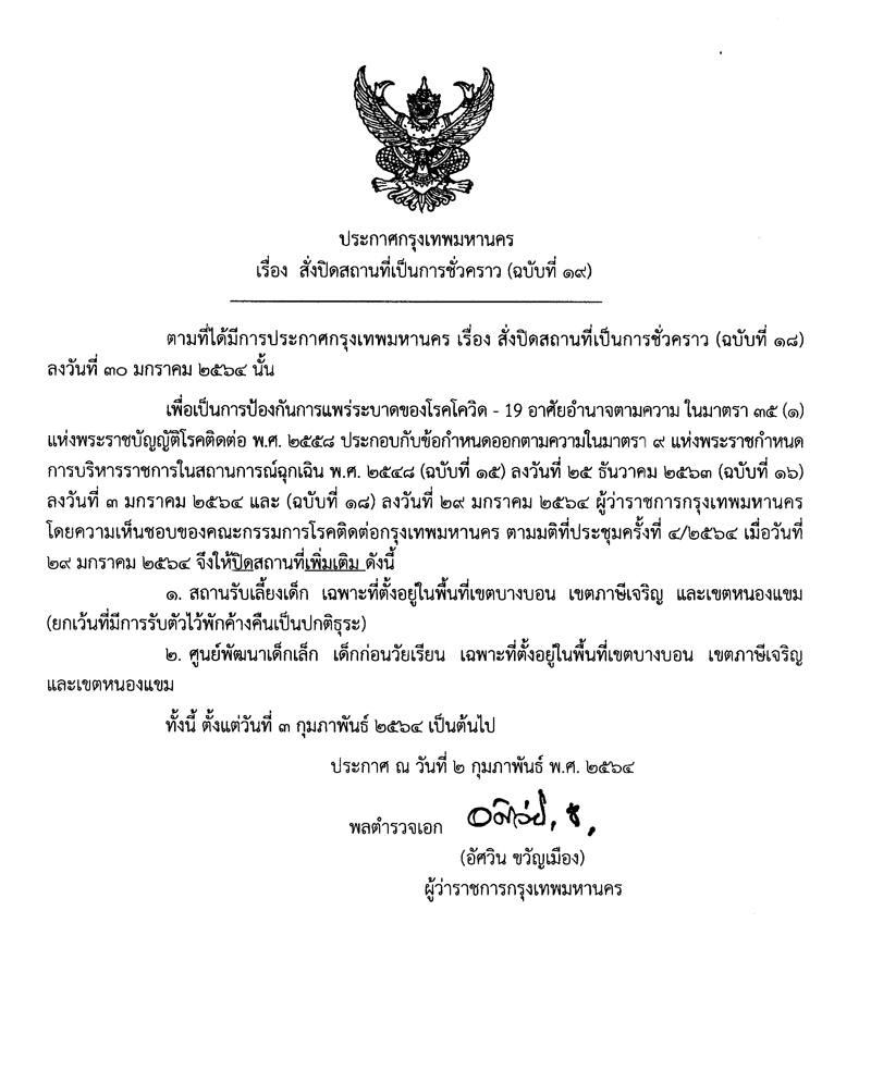 ประกาศกรุงเทพมหานครเรื่อง สั่งปิดสถานที่เป็นการชั่วคราว (ฉบับที่ 19) ระบุว่า ตามที่ได้มีการประกาศกรุงเทพมหานคร เรื่อง สั่งบิดสถานที่เป็นการชั่วคราว (ฉบับที่ 18) ลงวันที่ 3 มกราคม 2564 นั้น เพื่อเป็นการป้องกันการแพร่ระบาดของโรคโควิด – 19 อาศัยอำนาจตามความ ในมาตรา 35