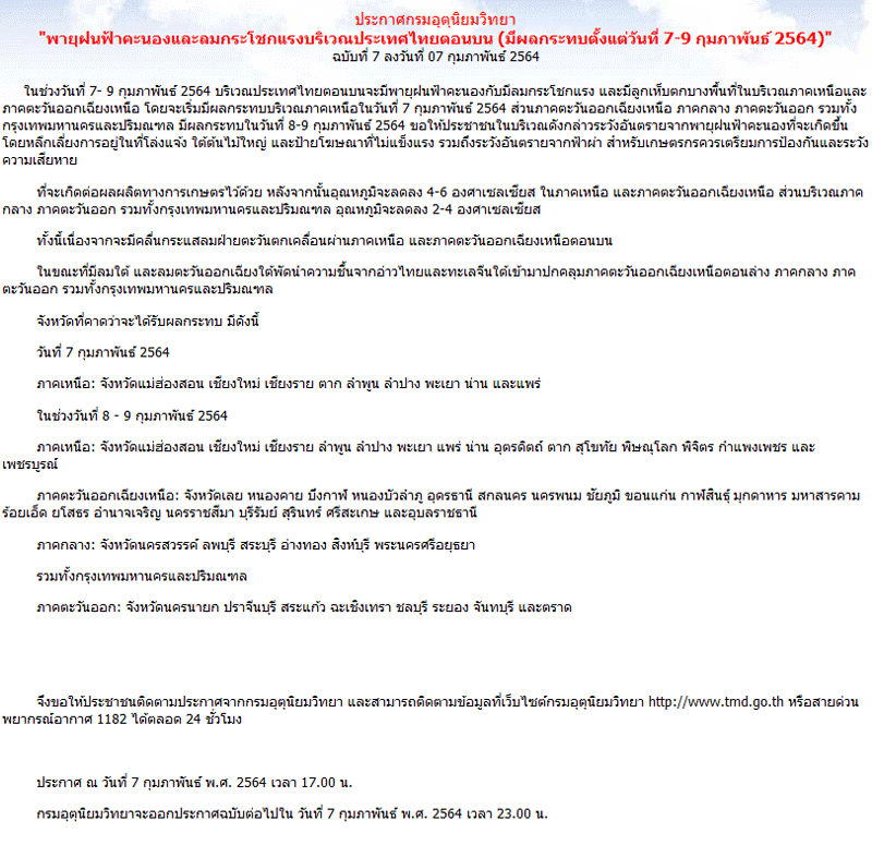 ประกาศกรมอุตุนิยมวิทยา “พายุฝนฟ้าคะนองและลมกระโชกแรงบริเวณประเทศไทยตอนบน (มีผลกระทบตั้งแต่วันที่ 7-9 กุมภาพันธ์ 2564)”ฉบับที่ 7 ลงวันที่ 07 กุมภาพันธ์ 2564