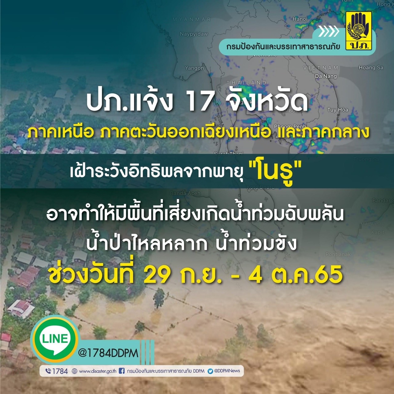 ปภ.เน้นย้ำ 17 จังหวัด ภาคเหนือ ภาคตะวันออกเฉียงเหนือ และภาคกลาง เฝ้าระวังอิทธิพลจากพายุ “โนรู”อาจเกิดน้ำท่วมฉับพลัน