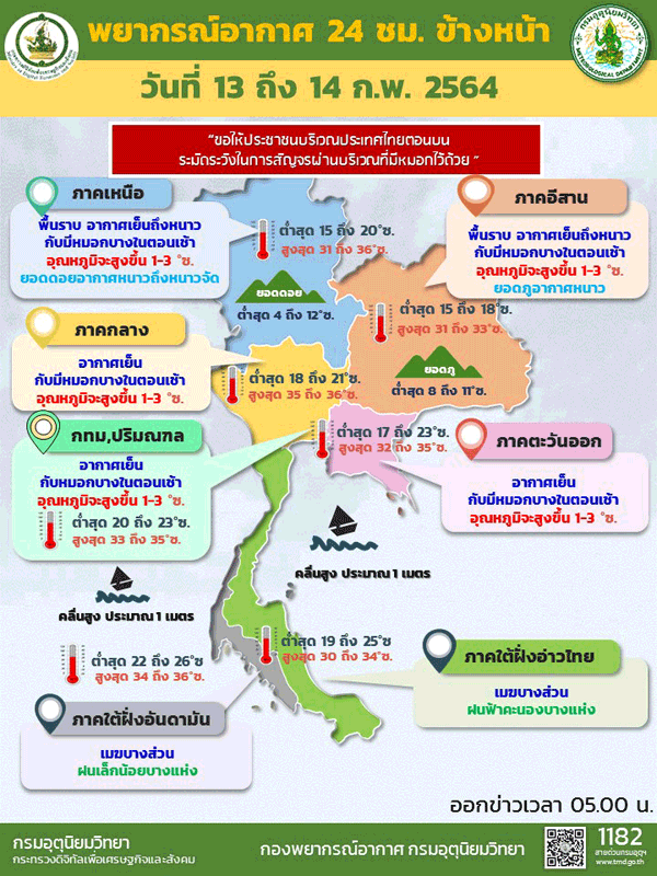 กรมอุตุนิยมวิทยา พยากรณ์อากาศ 24 ชั่วโมงข้างหน้า บริเวณความกดอากาศสูงหรือมวลอากาศเย็นที่ปกคลุมบริเวณประเทศไทยตอนบนและทะเลจีนใต้มีกำลังอ่อนลง ทำให้บริเวณดังกล่าวมีอุณหภูมิสูงขึ้น 1-3 องศาเซลเซียส กับมีหมอกในตอนเช้า แต่ยังคงมีอากาศเย็นถึงหนาวในภาคเหนือและภาคตะวัออกเฉียงเหนือ ขอให้ประชาชนบริเวณประเทศไทยตอนบนระมัดระวังในการสัญจรผ่านบริเวณที่มีหมอกไว้ด้วย