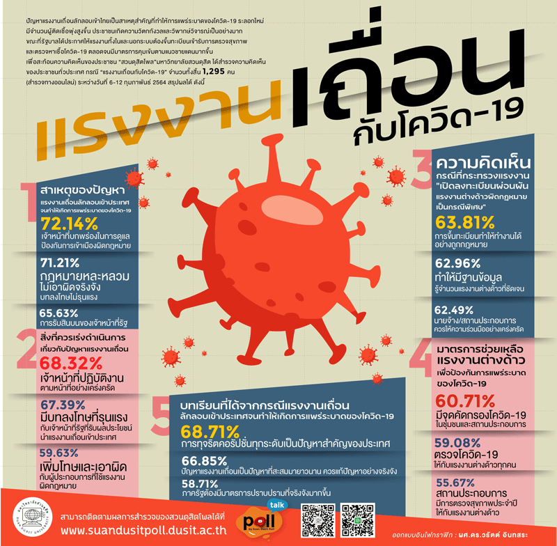สวนดุสิตโพล มหาวิทยาลัยสวนดุสิต สำรวจความคิดเห็นของประชาชน จำนวน 1,295 คน เรื่อง “แรงงานเถื่อนกับโควิด-19” ระหว่างวันที่ 6-12 กุมภาพันธ์ 2564