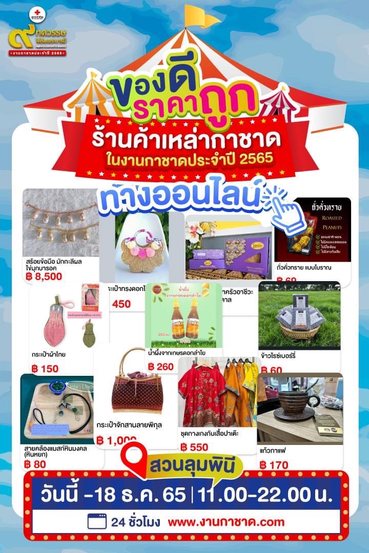 ชวนคุณมาชอปของดีเหล่ากาชาดที่ห้ามพลาดในงานกาชาดประจำปี 2565 นอกจากร้านอาหารละลานตาที่สวนลุมพินี ยังมีออนไลน์ให้คุณได้ชอปฟิน ๆ หนำใจอีกเพียบ อย่างสินค้าจากเหล่ากาชาดแต่ละจังหวัดที่รวบรวมของดี ของเด็ดมาให้จับจ่ายกันได้ชิล ๆ ทั่วทุกมุมโลก ชอปสนุก สุขใจ ได้กุศล คลิกเลย >>> https://www.redcrossfair.com/product?q=
