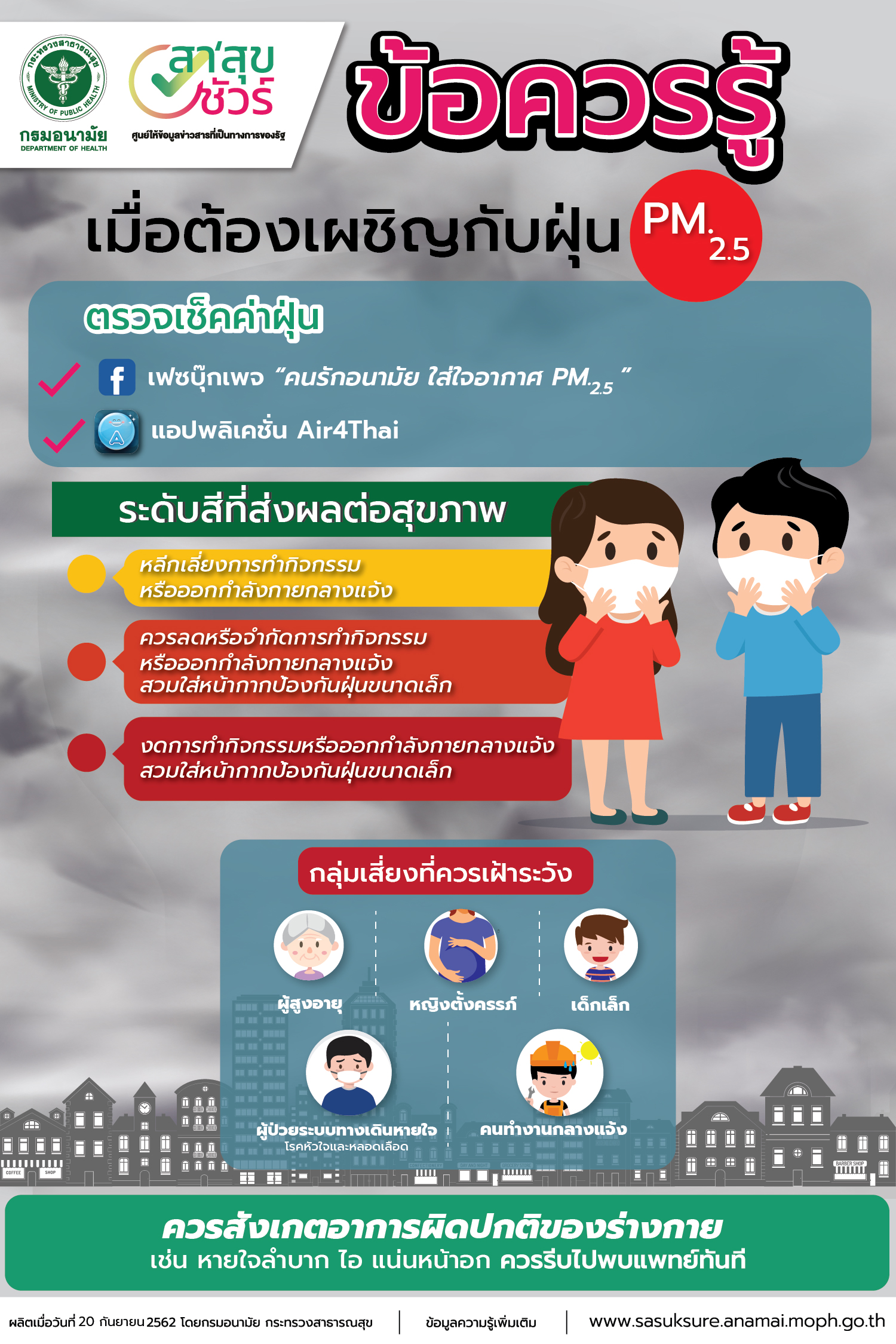 อาจส่งผลกระทบต่อสุขภาพประชาชนโดยเฉพาะกลุ่มเสี่ยง เด็กเล็ก ผู้สูงอายุ และผู้มีโรคประจำตัว ในพื้นที่ได้ ซึ่งจากฐานข้อมูลโรคที่เกี่ยวข้องกับมลพิษทางอากาศ กระทรวงสาธารณสุข ระหว่างวันที่ 1 มกราคม – 22 กุมภาพันธ์ พบว่าในพื้นที่ 17 จังหวัดภาคเหนือ มีจำนวนผู้ป่วยสะสมด้วยโรคที่เกี่ยวข้องกับมลพิษอากาศ จำนวน 189,265 ราย