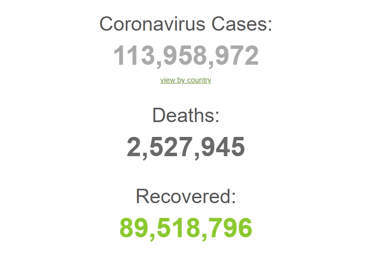 เว็บไซต์ Worldometers รายงานสถานการณ์โควิด-19 ประจำวันที่ 27 กุมภาพันธ์ 2564 ช่วงเวลาประมาณ 07.30 น.ตามเวลาประเทศไทย พบผู้ติดเชื้อทั่วโลกแล้ว 113,958,972 ราย เพิ่มขึ้น 416,167 ราย เสียชีวิต 2,527,945 ราย เพิ่มขึ้น 9,205 ราย รักษาหาย 89,518,796 ราย