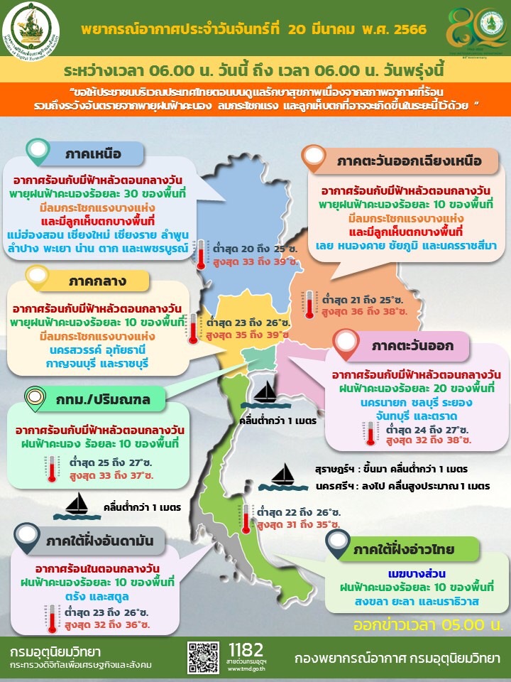 พยากรณ์อากาศประจําวันที่ 20 มีนาคม 2566 ลักษณะอาการทั่วไปใน 24 ชั่วโมงข้างหน้า หย่อมความกดอากาศต่ำเนื่องจากความร้อนปกคลุมภาคเหนือ ภาคตะวันออกเฉียงเหนือ และภาคกลางของประเทศไทย ลักษณะเช่นนี้ทำให้ประเทศไทยตอนบนมีอากาศร้อนโดยทั่วไปกับมีฟ้าหลัวในตอนกลางวัน ในขณะที่ลมใต้และลมตะวันออกเฉียงใต้ยังคงพัดปกคลุมภาคเหนือตอนล่าง ภาคตะวันออกเฉียงเหนือ ภาคกลาง และภาคตะวันออก ประกอบกับในช่วงวันที่ 20 – 22 มี.ค. 2566