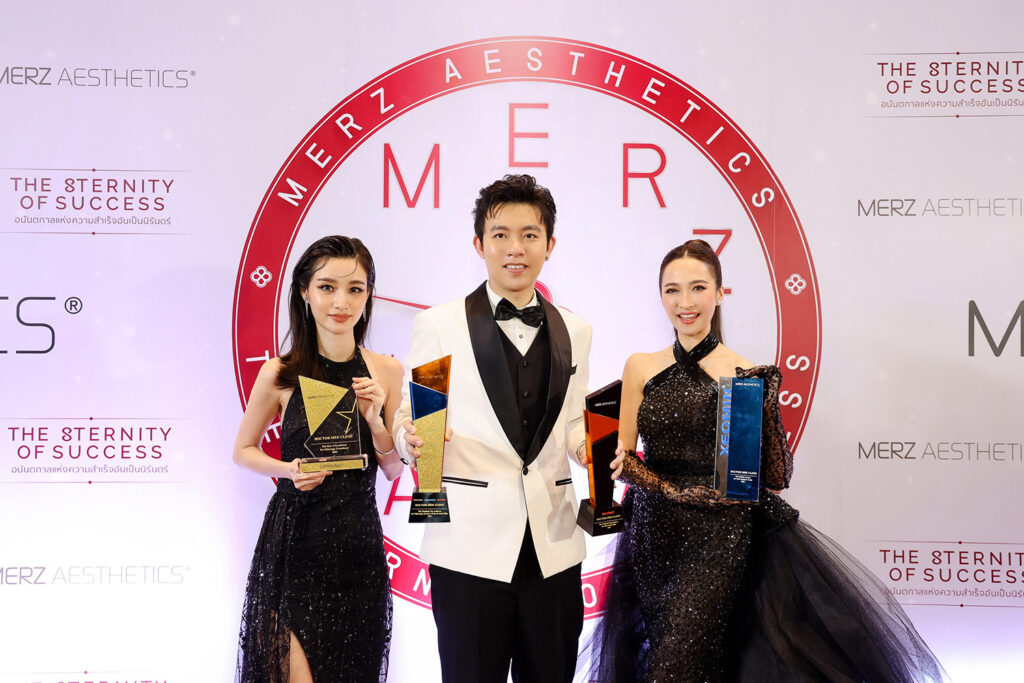 ล่าสุด อาจารย์หมอเมฆ ควงคู่ แพทย์หญิงพิชญานิน สื่อมโนธรรม ผู้ร่วมก่อตั้ง พร้อมทีมแพทย์มากประสบการณ์ เข้ารับรางวัลใหญ่ระดับประเทศอีก 4 รางวัล จาก Merz Aesthetics Thailand ได้แก่