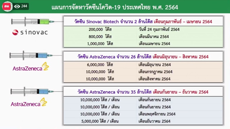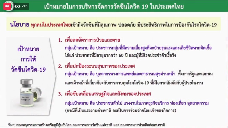 ดำเนินการตามแผนเดิมที่วางไว้ 2 ระยะ ระยะแรก กรณีที่มีวัคซีนจำกัด จะเน้นฉีดในกลุ่มบุคลากรทางการแพทย์และสาธารณสุขด่านหน้า, บุคคลที่มีโรคประจำตัว, ผู้สูงอายุ (อายุเกิน 60 ปีขึ้นไป) ระยะที่ 2 กรณีมีวัคซีนเพียงพอ จะเน้นฉีดบุคลากรทางการแพทย์ ที่นอกเหนือจากด่านหน้า, ผู้ประกอบการภาคการท่องเที่ยว, ผู้ที่ต้องเดินทางระหว่างประเทศ, นักการทูต และแรงงานในภาคอุตสาหกรรม ภาคบริการ ซึ่งแผนการจัดหาวัคซีน นั้น ประกอบด้วย ช่วงเดือน ก.พ. – เม.ย. 64 ใช้ วัคซีน Sinovac จำนวน 2 ล้านโดส, เดือน มิ.ย. – ส.ค. 64 ใช้ วัคซีน AstraZeneca จำนวน 26 ล้านโดส และ เดือน ก.ย. – ธ.ค. 64 ใช้วัคซีน AstraZeneca จำนวน 35 ล้านโดส