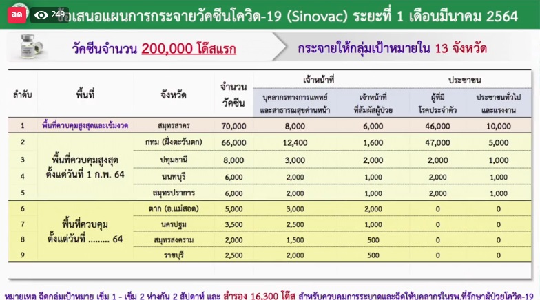ทั้งนี้ ระยะแรก ช่วงเดือน มี.ค. กระทรวงสาธารณสุขจะกระจายวัคซีนไปยังพื้นที่ 13 จังหวัดซึ่งเป็นกลุ่มเป้าหมายแรก จำนวน 200,000 โดส ซึ่ง 13 จังหวัดดังกล่าว ส่วนใหญ่เป็นพื้นที่ควบคุมสูงสุดและเข้มงวด เช่น สมุทรสาคร, ปทุมธานี และ กทม. โดยมี 4 จังหวัด คือ ชลบุรี, ภูเก็ต, สุราษฎร์ธานี (เกาะสมุย) และ เชียงใหม่ ซึ่งเป็นพื้นที่ท่องเที่ยวมีส่วนสำคัญในการขับเคลื่อนเศรษฐกิจของประเทศ ขณะที่เดือนเม.ย. จะกระจายวัคซีนจำนวน 800,000 โดส ในกลุ่มเป้าหมาย 18 จังหวัด และในระยะที่ 2 จะมีวัคซีน 61 ล้านโดส กระจายในทุกจังหวัด