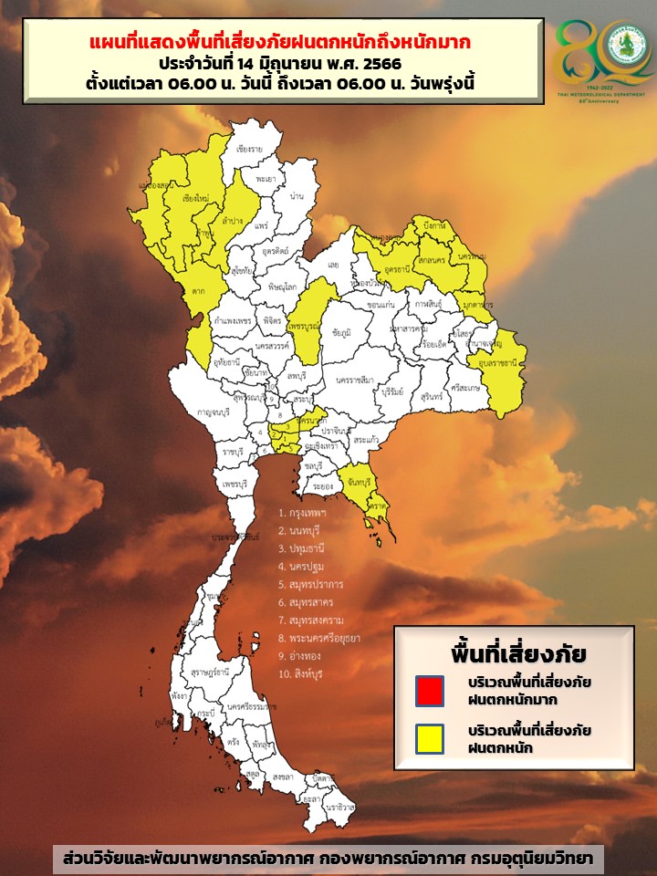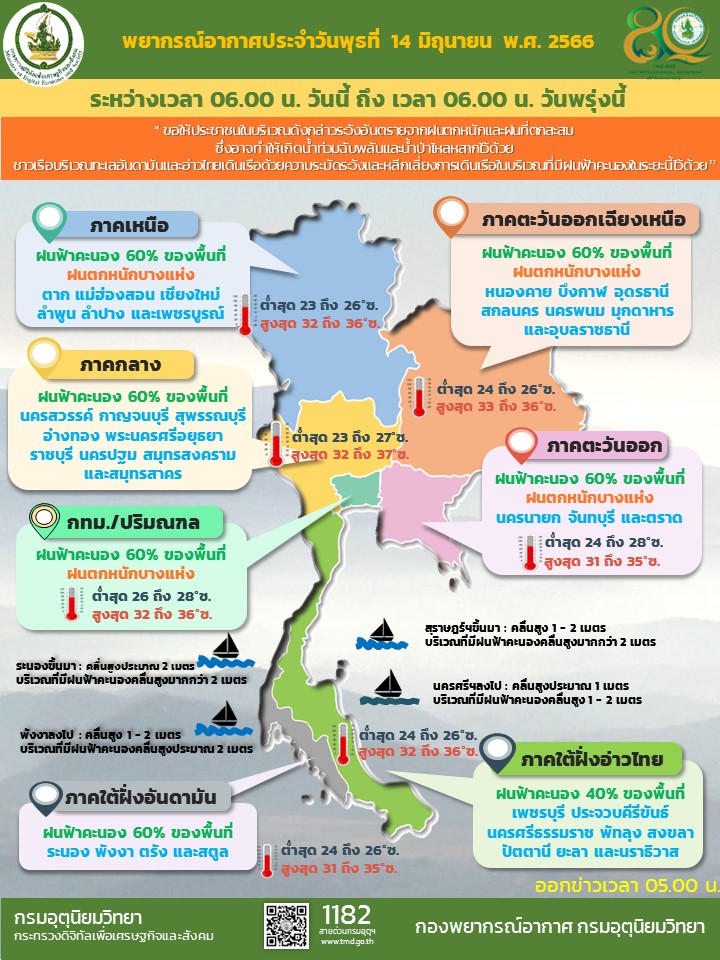 พยากรณ์อากาศ วันที่ 14 มิถุนายน 2566 มรสุมตะวันตกเฉียงใต้กำลังปานกลางพัดปกคลุมทะเลอันดามัน ประเทศไทย และอ่าวไทย ในขณะที่ร่องมรสุมพาดผ่านตอนบนของภาคเหนือ และประเทศลาวตอนบน เข้าสู่หย่อมความกดอากาศต่ำบริเวณประเทศเวียดนามตอนบน ลักษณะเช่นนี้ทำให้ประเทศไทยยังคงมีฝนฟ้าคะนองเกิดขึ้นได้ ส่วนมากบริเวณด้านรับมรสุม โดยมีฝนตกหนักบางแห่งในภาคเหนือ ภาคตะวันออกเฉียงเหนือ และภาคตะวันออก ขอให้ประชาชนในบริเวณดังกล่าวระวังอันตรายจากฝนตกหนักและฝนที่ตกสะสม ซึ่งอาจทำให้เกิดน้ำท่วมฉับพลันและน้ำป่าไหลหลากไว้ด้วย