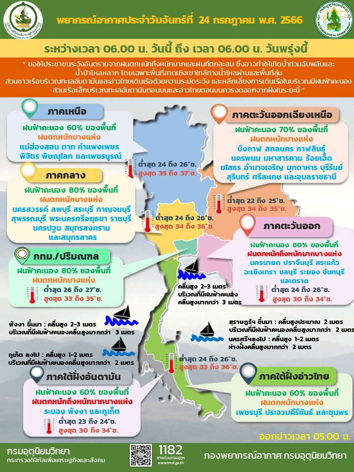 พยากรณ์อากาศ วันที่ 24 กรกฎาคม 2566 ประเทศไทยยังคงมีฝนตกต่อเนื่อง และมีฝนตกหนักบางแห่งในภาคเหนือตอนล่าง ภาคตะวันออกเฉียงเหนือ ภาคกลาง รวมทั้งกรุงเทพมหานครและปริมณฑล และภาคใต้