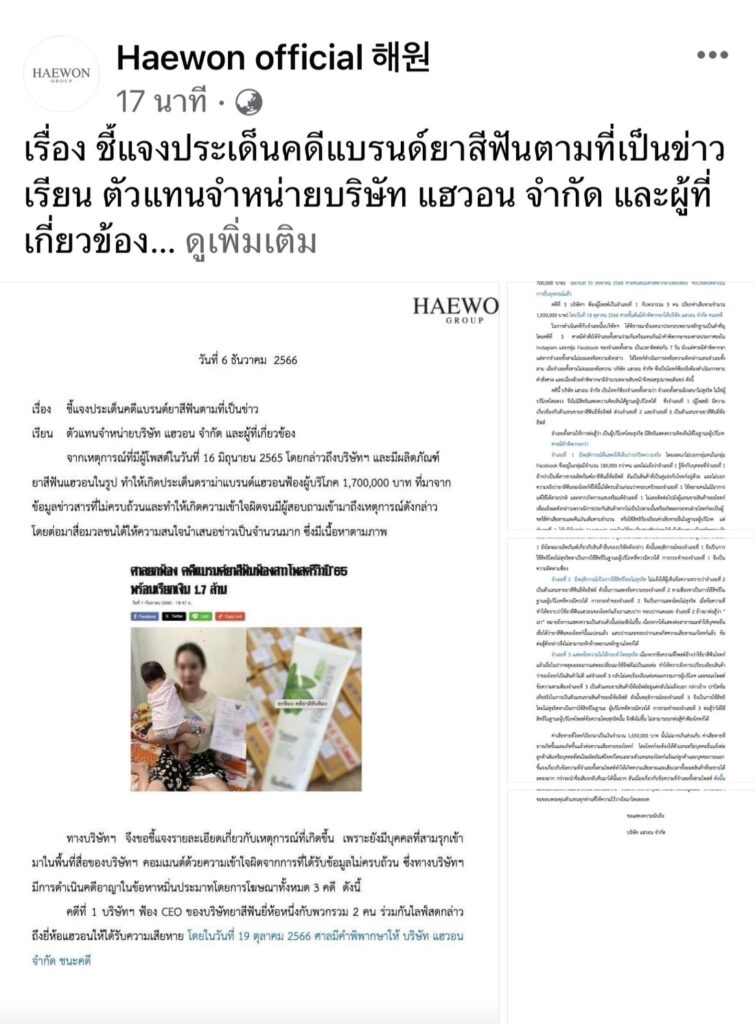 คดีที่ 1 บริษัทฯ ฟ้อง CEO ของบริษัทยาสีฟันยี่ห้อหนึ่งกับพวกรวม 2 คน ร่วมกันไลฟ์สดกล่าวถึงยี่ห้อแฮวอนให้ได้รับความเสียหาย โดยในวันที่ 19 ตุลาคม 2566 ศาลมีคำพิพากษาให้ บริษัท แฮวอน จำกัด ชนะคดี